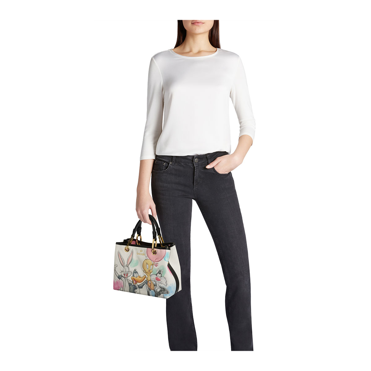 Bolso de mano de tamaño mediano en color negro, con doble asa y bandolera logotipada, extraíble y ajustable, para una doble portabilidad. En el interior incluye una pochette extraíble que puede utilizarse como segundo bolso. El estampado frontal celebra el icónico universo de los Looney Tunes con Bugs Bunny, el Pato Lucas, Piolín y Silvestre: una explosión de color y alegría que convierte este modelo en una pieza dinámica, original y perfecta para quienes disfrutan destacarse con un toque de ironía.