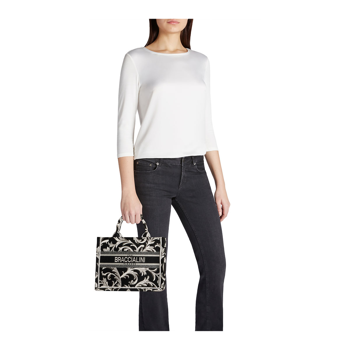 Sac à main de taille petite à moyenne, réalisé en tissu, doté de doubles poignées et d’une bandoulière réglable et amovible pour une double portabilité. La broderie, élégante et spectaculaire, se déploie en motifs baroques aux lignes sinueuses sur fond noir, créant un contraste bicolore raffiné. Le logo Braccialini s’intègre parfaitement au centre de la composition, encadré de bandes décoratives. À l’intérieur, une pochette amovible et pratique ajoute de la fonctionnalité à cet accessoire au caractère affirmé et sophistiqué.