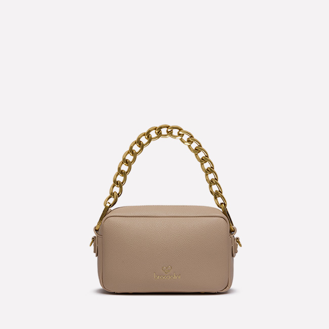 Sac à bandoulière en similicuir marron, au design compact avec rabat et poches zippées sur le devant, enrichi de détails en métal doré. La bandoulière réglable et amovible permet un double port, à l'épaule ou en travers du corps. Les doubles poches avant allient style et praticité, tandis que les détails dorés ajoutent une touche d'élégance raffinée. |