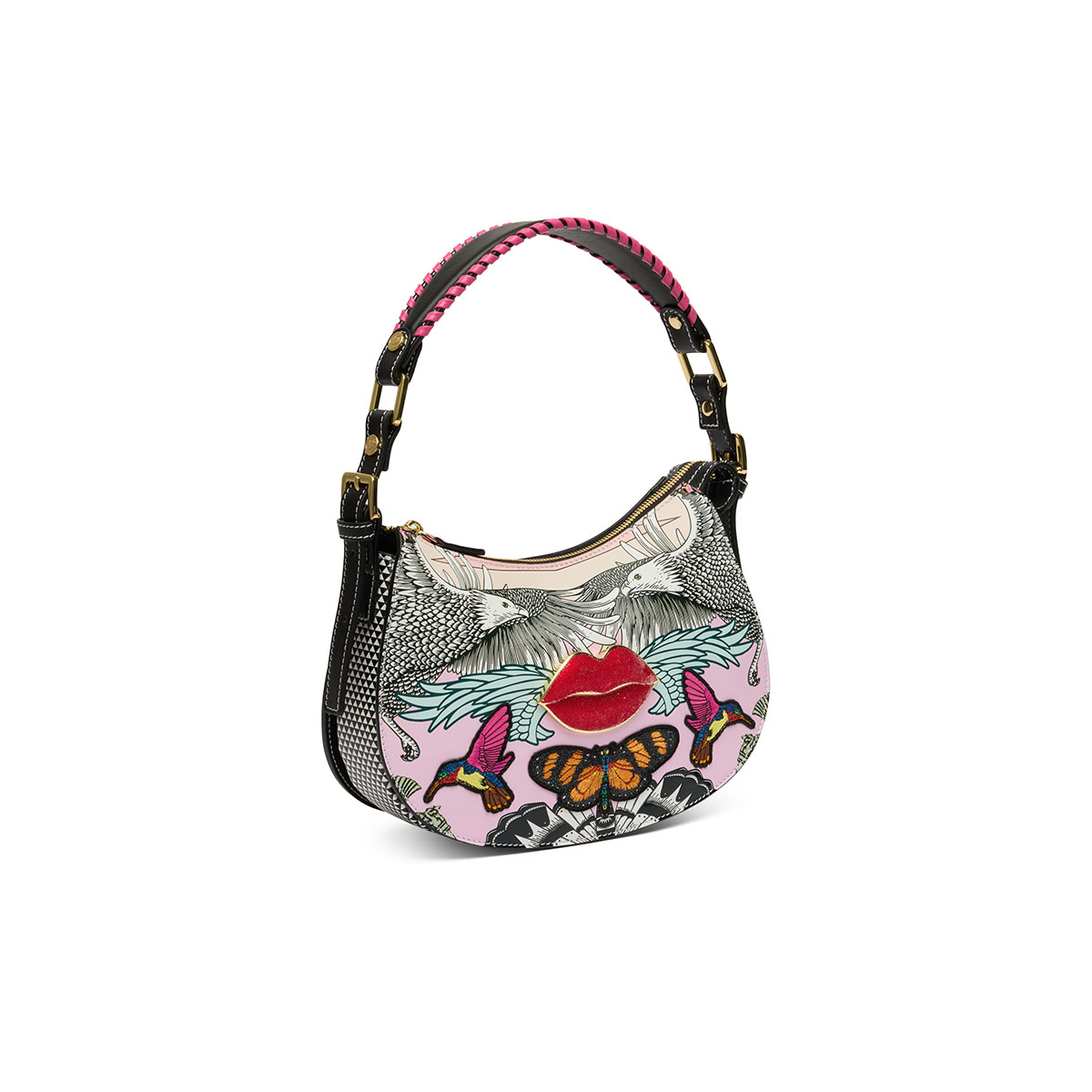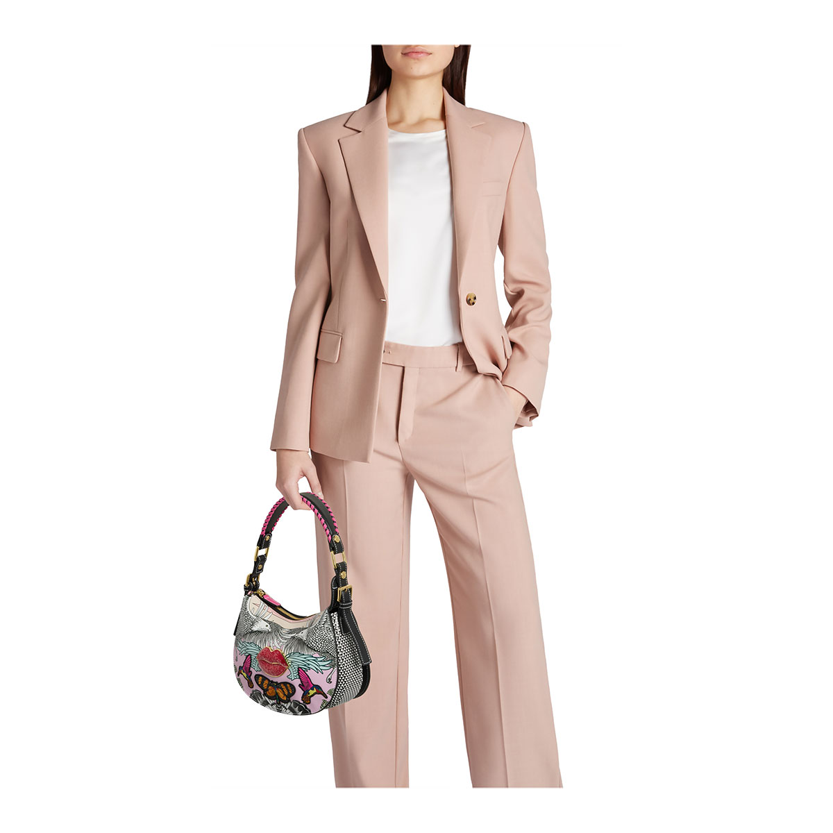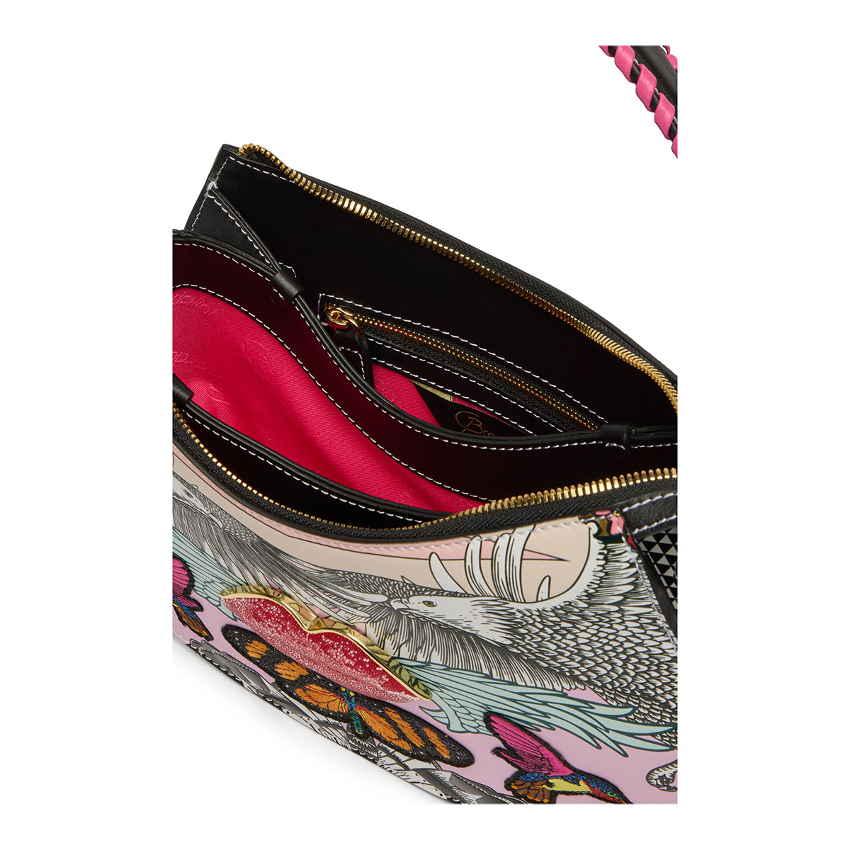 Ginevra est la version de sac semi-rigide signée Graziella Braccialini, un véritable chef-d’œuvre de maroquinerie. Sa forme en demi-lune renferme une double construction à soufflets plats avec un passepoil nervuré qui soutient la structure centrale. Fermé par une fermeture à glissière aux tirettes sculptées, le sac s’ouvre sur trois compartiments dotés de poches. La bandoulière, réglable grâce aux boucles latérales, est agrémentée d’un épaulette façonnée. |