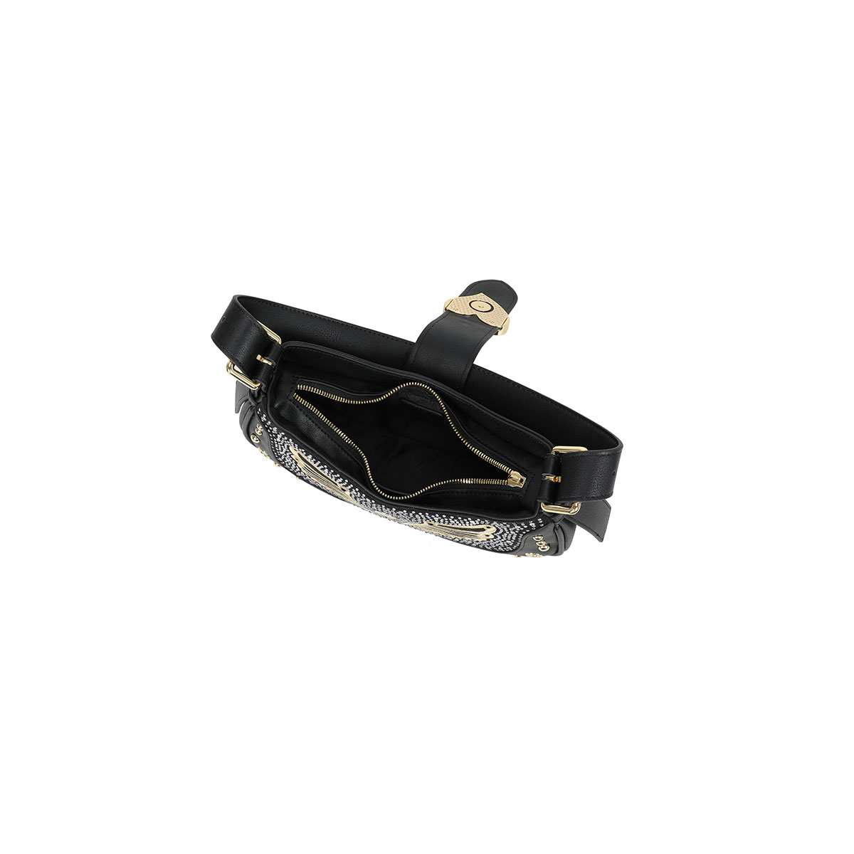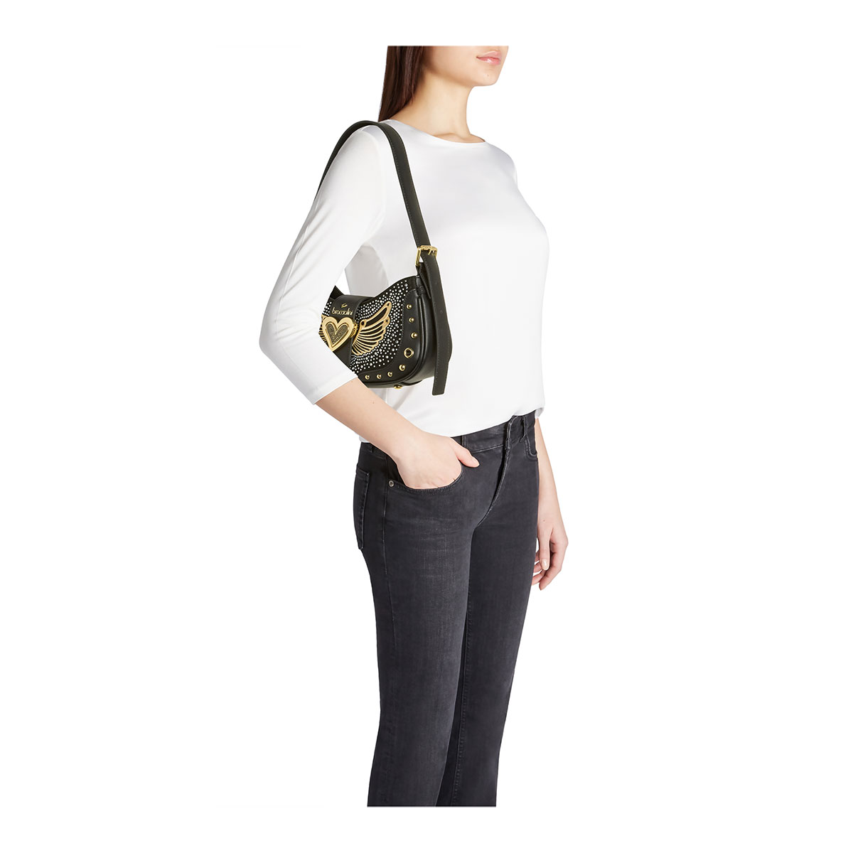 L’intemporel sac à épaule noir se transforme en véritable manifeste de style audacieux. Cette création se distingue par une spectaculaire « pluie » de clous et de points lumineux qui scintillent sur une base blanche, évoquant l’énergie des lumières urbaines. Au centre, un accessoire métallique en forme de cœur signe le design, apportant une allure rock-glam à un modèle pensé pour celles et ceux qui ne veulent pas passer inaperçus, même après la tombée de la nuit.