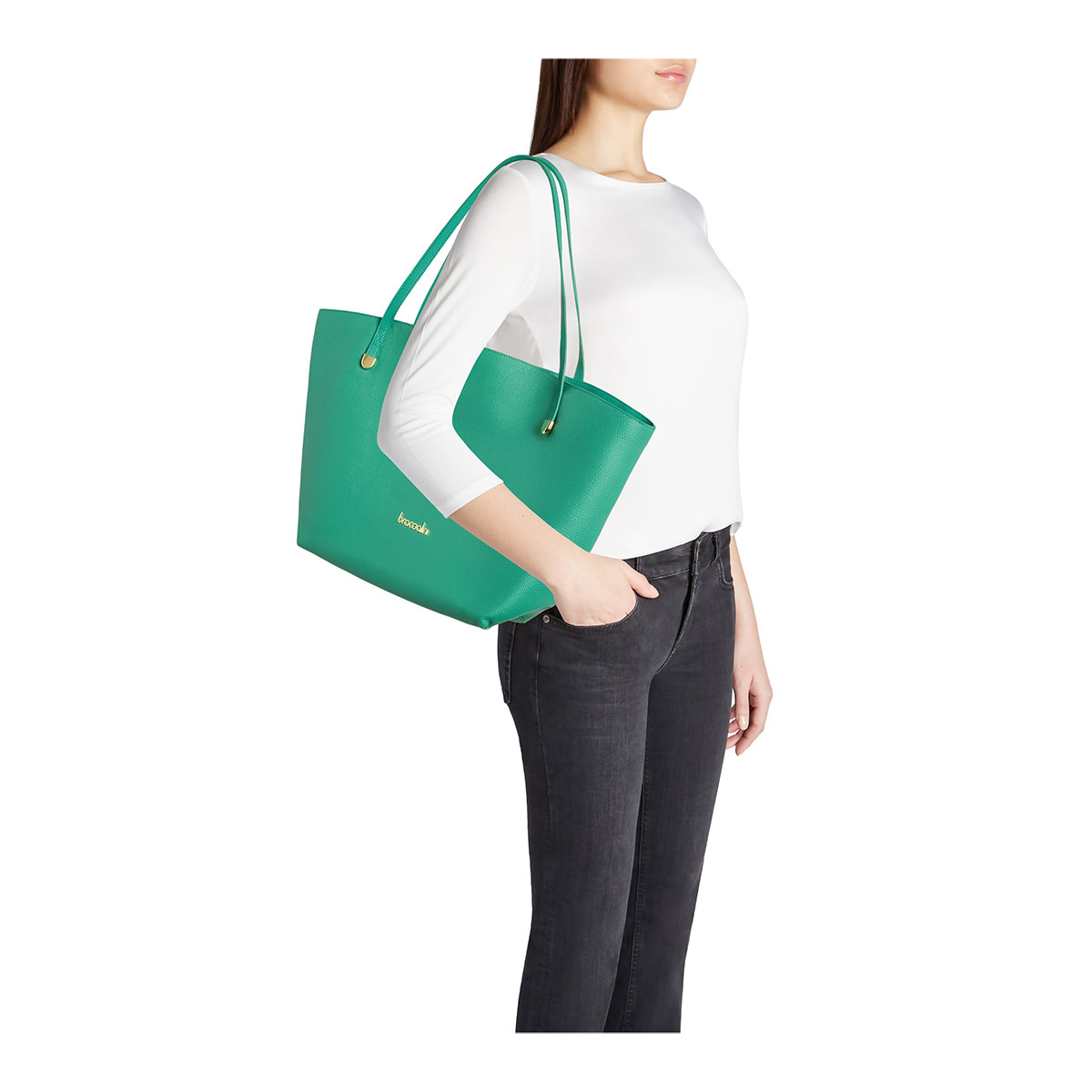 Sac shopping en cuir souple effet grain dollaro, décliné dans une élégante teinte émeraude. Ses lignes fluides et son volume généreux en font le compagnon idéal du quotidien, élégant et discret, sublimé par de longues doubles anses assurant un porté épaule confortable. À l’intérieur, une pochette amovible et pratique permet de garder en sécurité les objets les plus précieux. Un modèle raffiné, léger et spacieux, conçu pour celles et ceux qui rêvent d’un sac pratique au charme romantique.