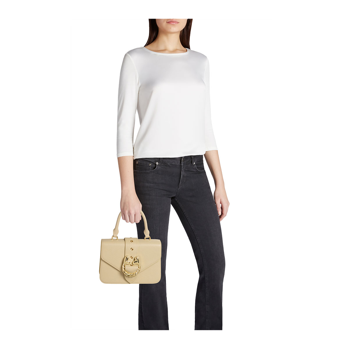 Sac à main moyen en cuir beige à la silhouette compacte et épurée, sublimé par une élégante fermeture bijou : un torchon doré orné de cristaux et de doubles cœurs, symbole de la ligne Baroque. L’anse unique et la bandoulière réglable et amovible offrent un double porté, parfait pour celles et ceux qui recherchent style et romantisme dans chaque détail.
