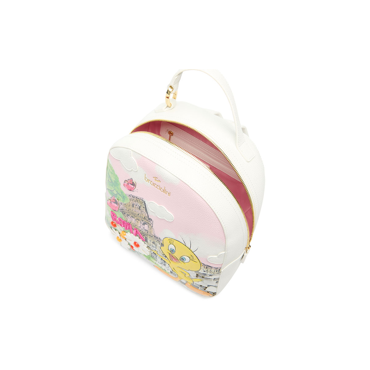 Petit sac à dos en similicuir, parfait pour apporter une touche ludique et dynamique aux looks du quotidien. L’imprimé, inspiré de la ville de Rome, met en scène Titi parmi des marguerites en relief, des papillons et l’emblématique Colisée. Les détails pailletés et les applications 3D le rendent unique et original. Doté de bretelles réglables, d’une poignée supérieure et d’une fermeture zippée pratique, il allie style et fonctionnalité pour celles et ceux qui aiment se démarquer avec couleur et humour.