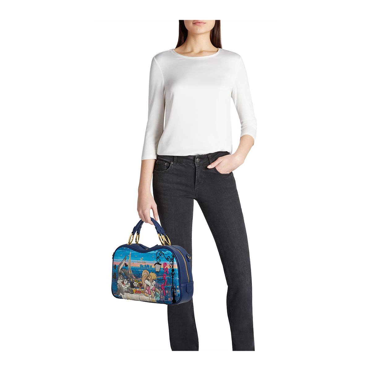 Sac à main en similicuir avec doubles poignées et bandoulière amovible et réglable pour une double portabilité. Sa forme compacte est sublimée par un imprimé romantique inspiré de Paris, avec Bugs Bunny et Lola dans un tendre moment devant la tour Eiffel. Cœurs pailletés, détails en relief et applications inspirées du voyage enrichissent le design, en faisant le compagnon idéal pour celles et ceux qui aiment exprimer leur style avec douceur et fantaisie.