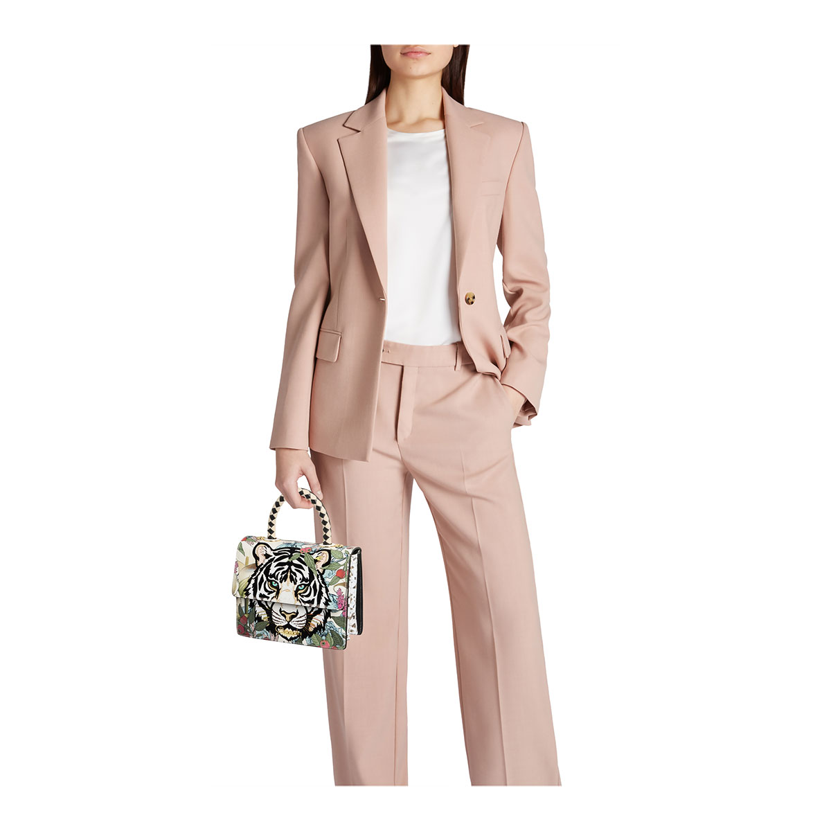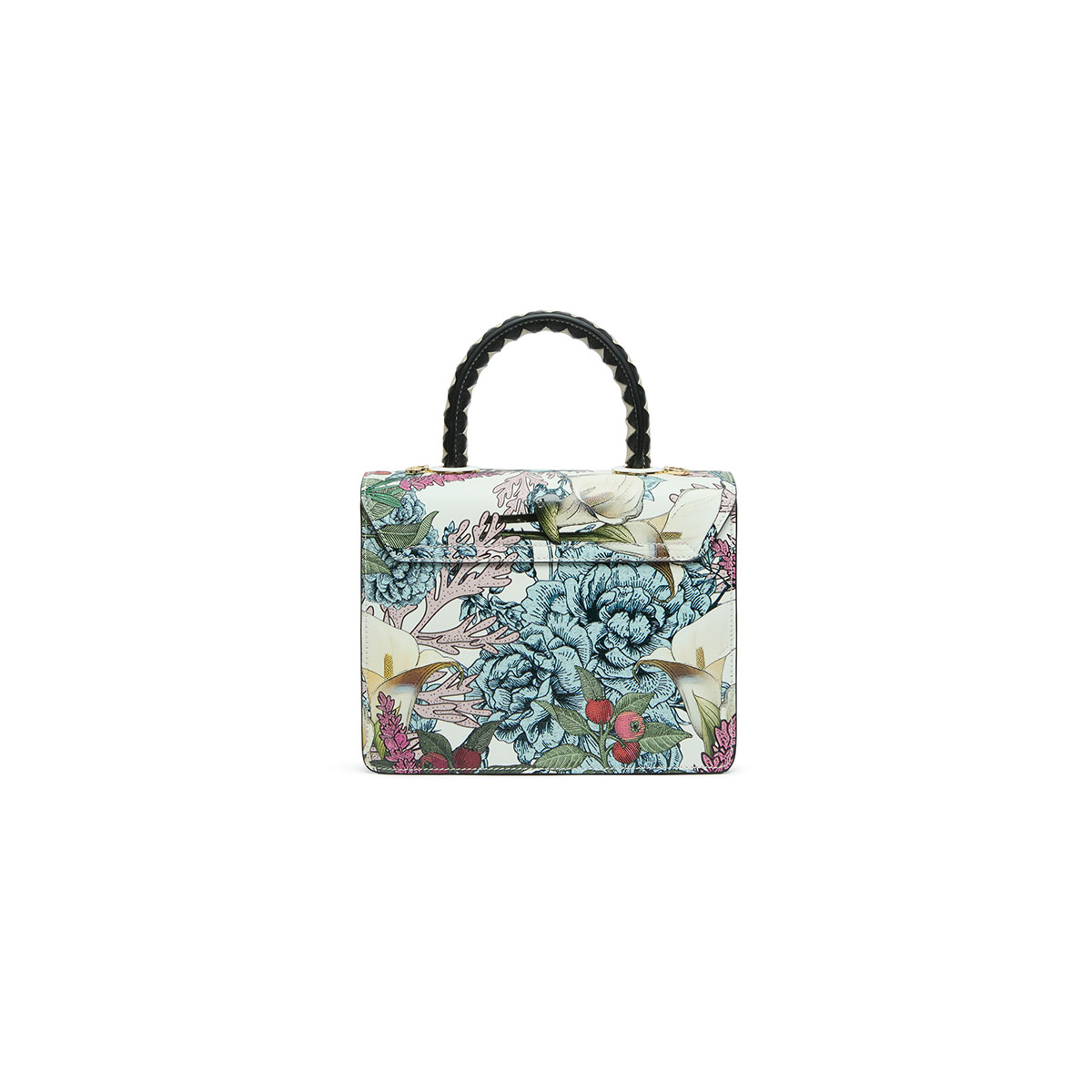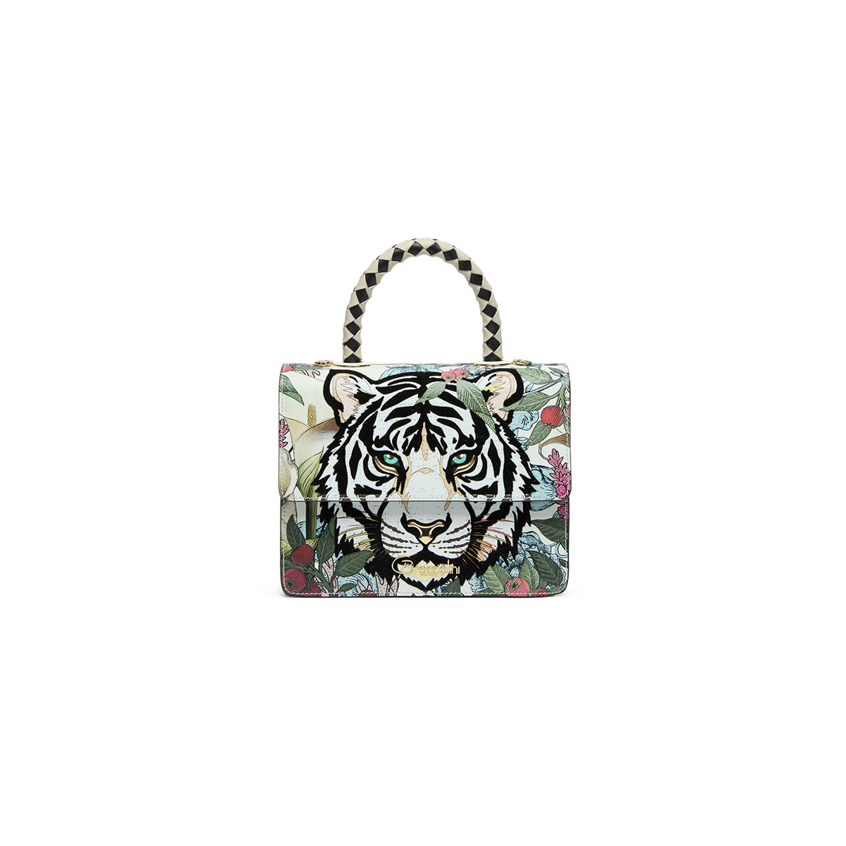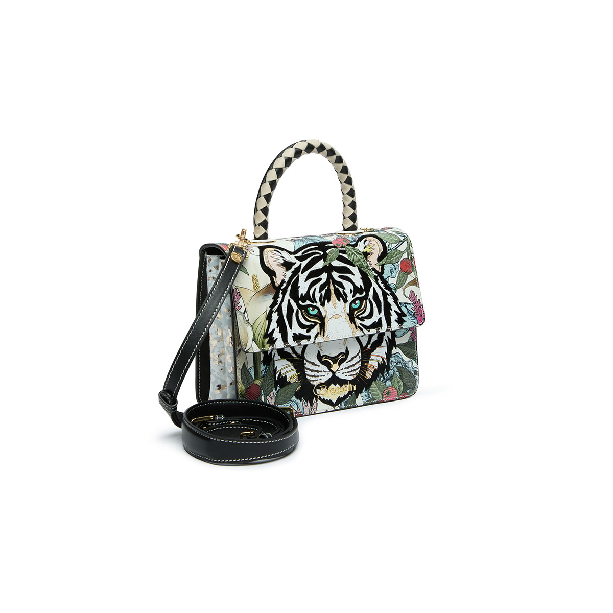 Cette Audrey allie audace et raffinement dans cette version décorée du visage d’un tigre blanc, véritable vedette de la scène. Son regard hypnotique, illuminé par des détails façon bijoux, se détache sur le rabat frontal, encadré par une profusion de fleurs, de baies et de feuilles exotiques. Le fond clair met en valeur les contrastes entre techniques mixtes d’impression et de broderie qui apportent profondeur et vivacité au cuir. La poignée tressée en noir et blanc ajoute une touche affirmée à ce sac compact mais au caractère puissant. |
