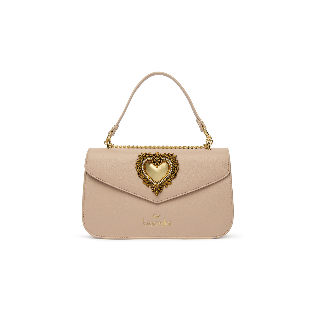 Sac à bandoulière en similicuir taupe, avec bandoulière réglable pouvant aussi se porter en travers. Le cœur bijou doré, inspiré du style baroque, apporte une touche spectaculaire à un modèle intemporel. La bandoulière chaîne avec détail assorti garantit polyvalence et confort pour chaque occasion. |