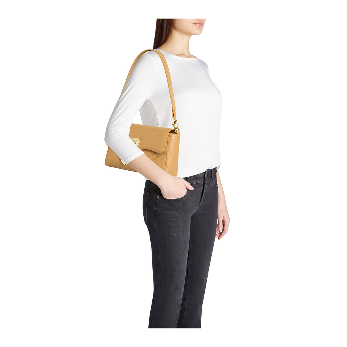 Sac à épaule en cuir au profil allongé et féminin. Le design est sublimé par le logo Braccialini en métal doré sur le devant, tandis que la double anse interchangeable permet de le porter à la main, à l’épaule ou en bandoulière, avec élégance en toute occasion. La fermeture par bouton aimanté dissimule un intérieur spacieux et bien organisé. Un accessoire raffiné et polyvalent, parfait pour donner du caractère à chaque look.