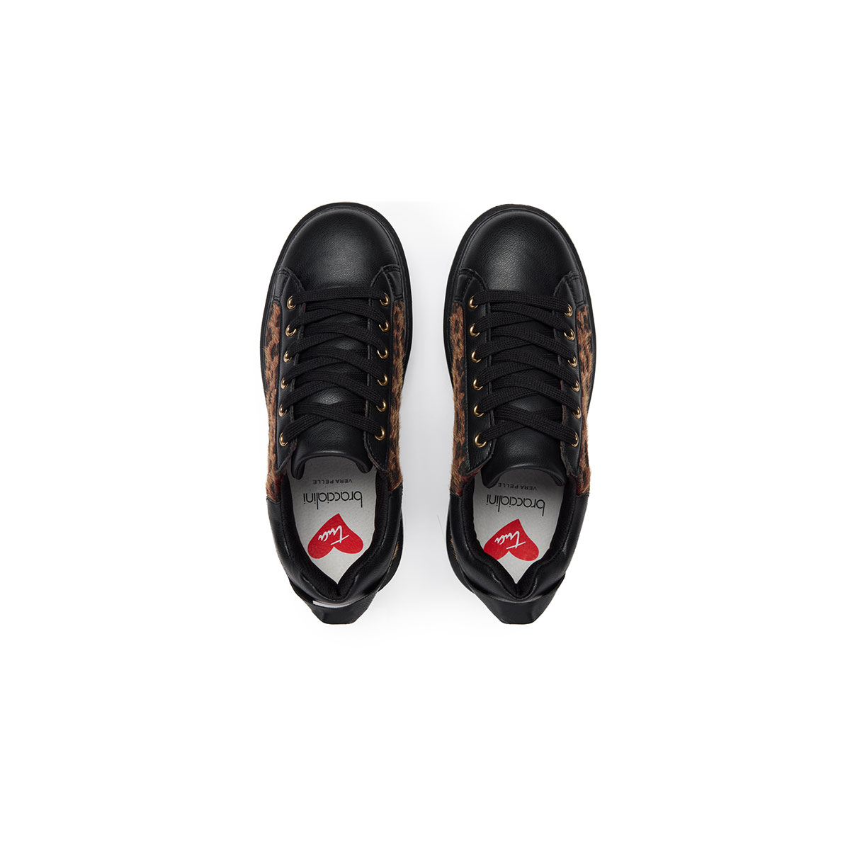 Sneakers confortables avec semelle intérieure en cuir, base unie noire et empiècements latéraux en matière effet poulain à motif léopard, qui ajoutent une touche audacieuse et sophistiquée. Le design épuré de la tige s’associe à la semelle plateforme en caoutchouc noir, pour une silhouette affirmée mais confortable. Le logo Braccialini doré à l’arrière complète le modèle d’une note précieuse et distinctive. |