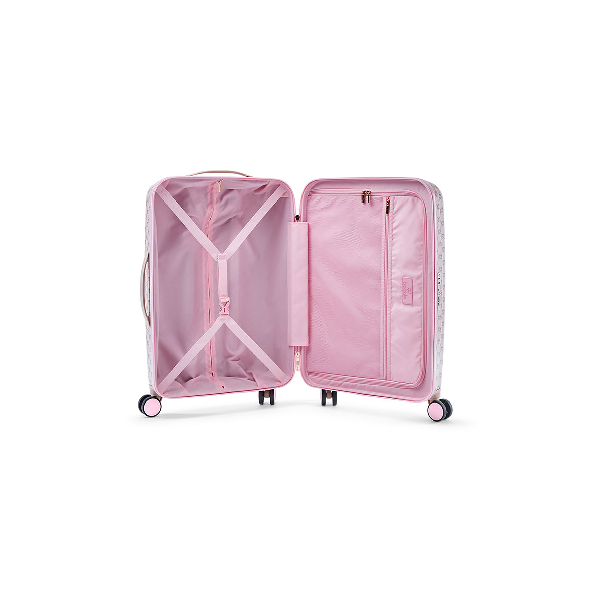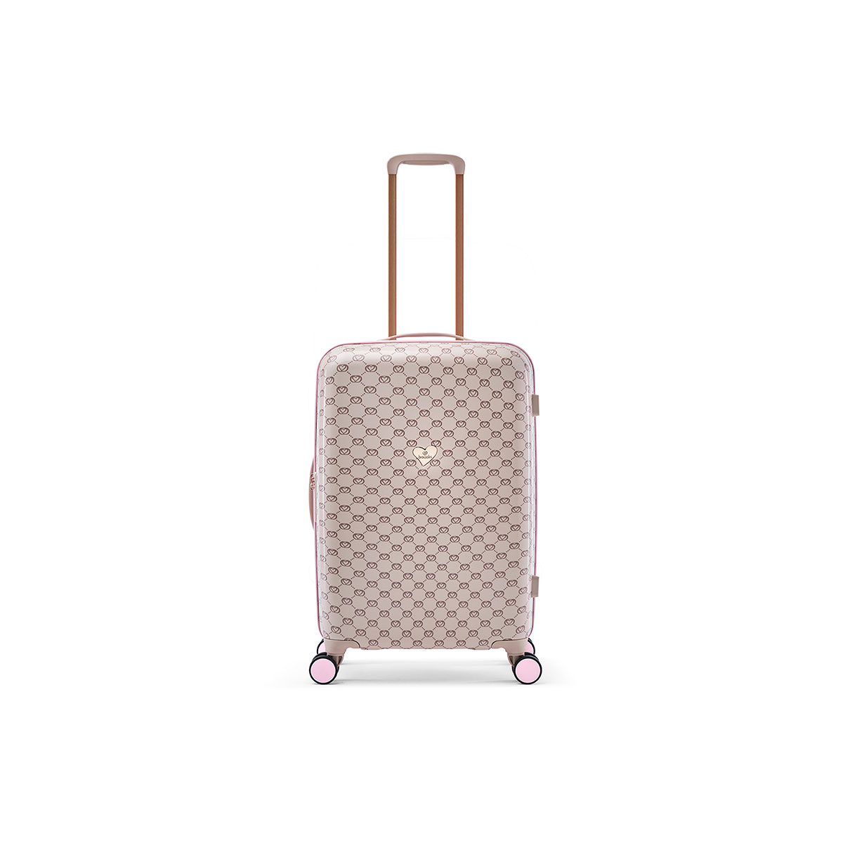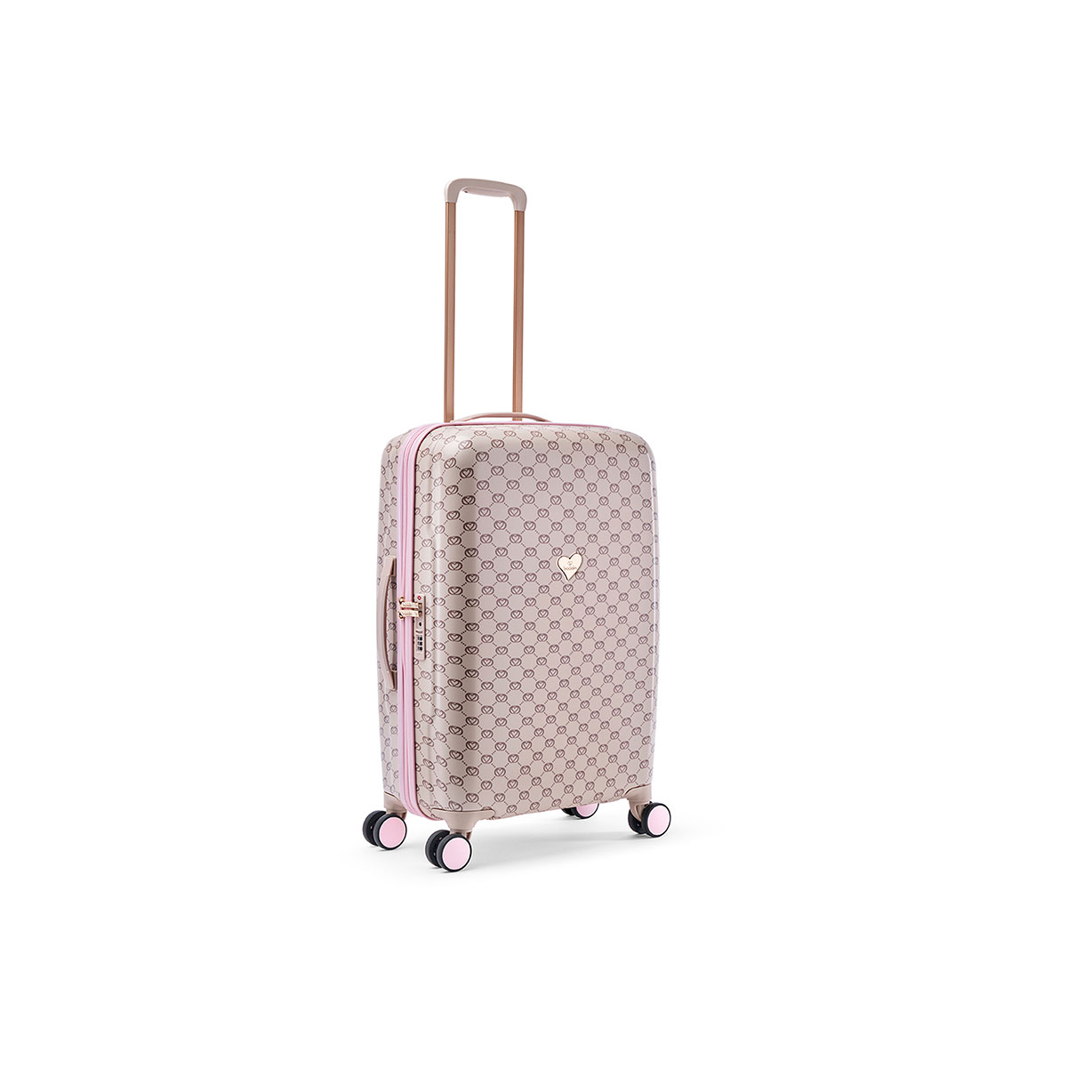 Voyagez avec style grâce au trolley moyen rigide Braccialini, un accessoire raffiné et pratique pour celles qui aiment se démarquer. Le petit cœur Braccialini, symbole distinctif de la maison, s'impose comme le protagoniste d'un élégant motif imprimé qui orne toute la surface, créant une fantaisie Monogram délicate et féminine, sublimée par le logo cœur en évidence. Doté d'une fermeture plate à combinaison TSA avec zip extensible pour augmenter le volume, il est équipé d'une poignée télescopique réglable et de quatre roulettes multidirectionnelles à 360° pour un déplacement fluide. L'intérieur organisé avec double compartiment et sangles de maintien des vêtements permet de garder tout en ordre durant le voyage. Le modèle est complété par une étiquette de bagage coordonnée et une housse de rangement.