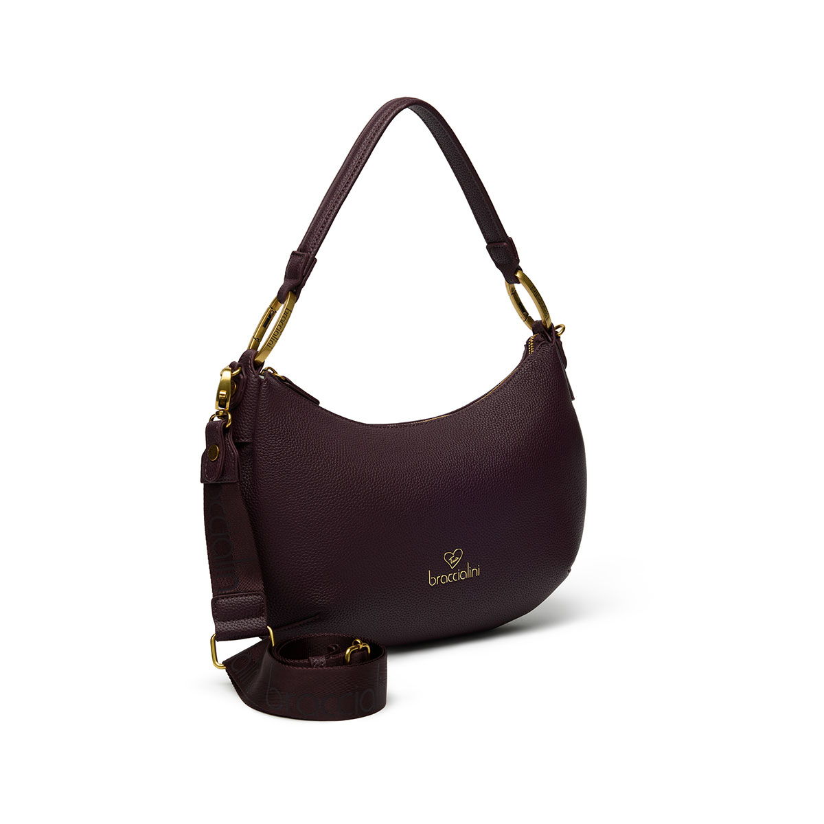 Sac hobo bordeaux avec une poignée et une bandoulière amovible et réglable avec logo pour une double portabilité. À l’intérieur, une pochette amovible pouvant être utilisée comme deuxième sac. Le design est sublimé par une chaîne dorée amovible à larges maillons, ajoutant une touche glamour et distinctive. |