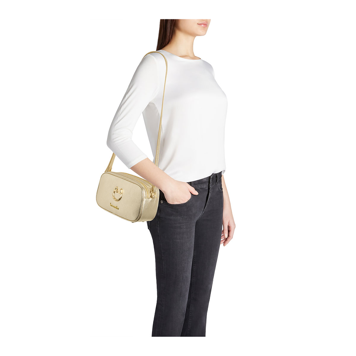 Sac bandoulière en cuir doré, à la ligne compacte et minimaliste. Le devant est sublimé par un élégant bijou en métal doré : un anneau décoratif tressé, soutenu par deux cœurs stylisés. Avec une bandoulière réglable à chaîne qui apporte une touche raffinée. Doté d’une double fermeture zippée et d’un intérieur avec poches, il est parfait pour ranger avec ordre les essentiels. Un modèle sobre et polyvalent, à porter au quotidien avec une élégance naturelle.