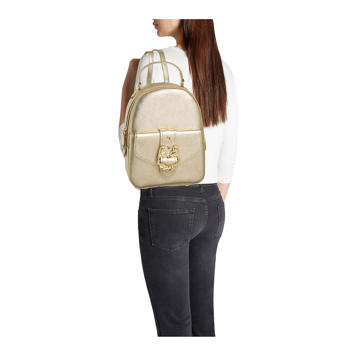 Zaino in pelle di color oro dal design semi strutturato e femminile. L'accessorio gioiello dorato a forma di torchon con cuori è protagonista assoluto, conferendo un tocco romantico e scenografico. Comodo e raffinato, è dotato di spallacci regolabili e manico superiore.