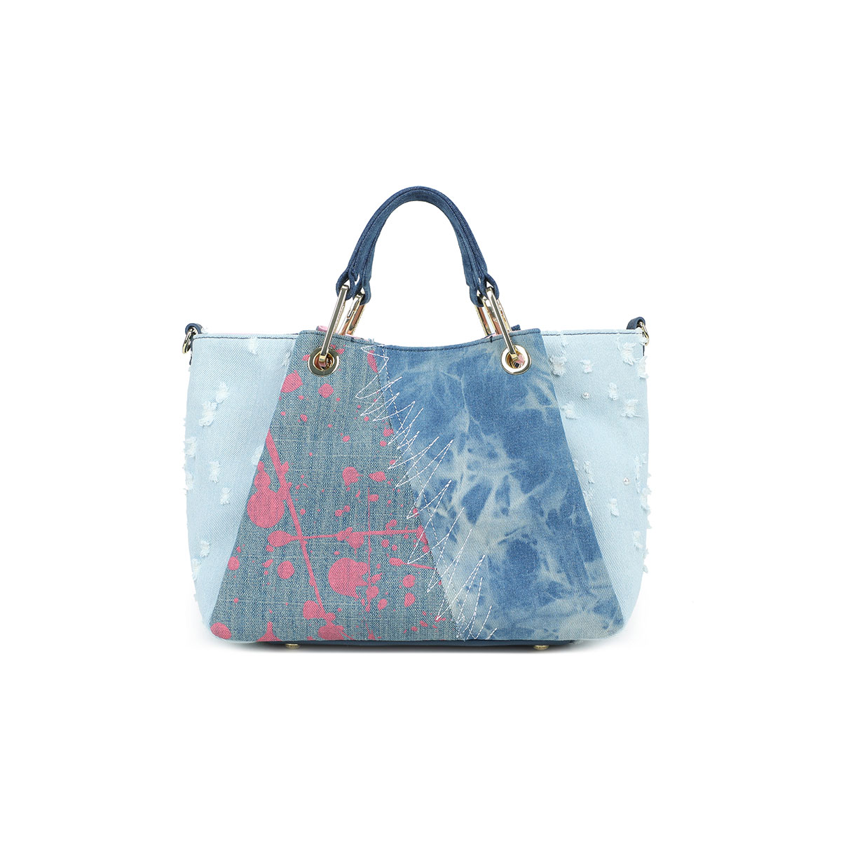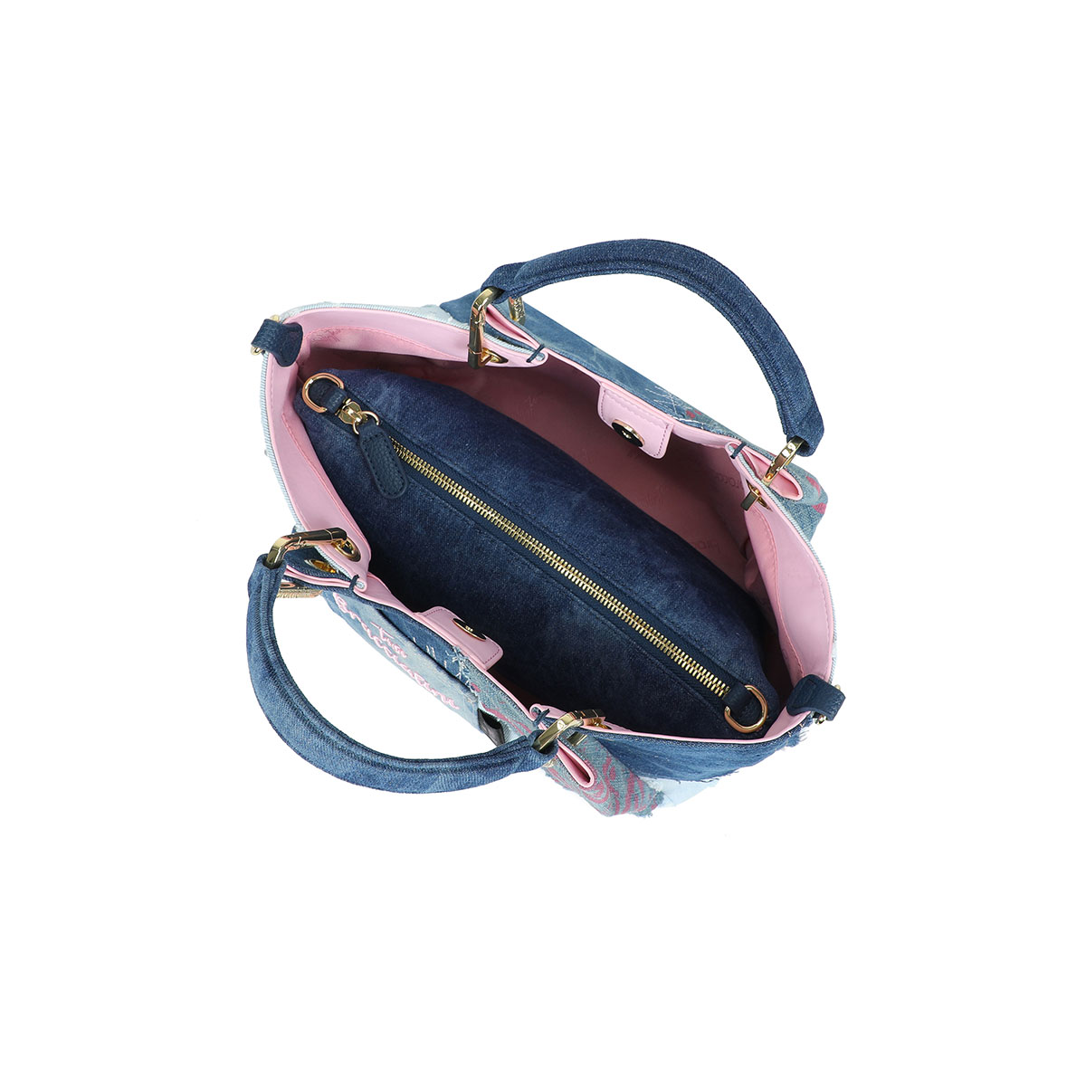 Borsa a mano di medie dimensioni con doppi manici, dal design versatile e capiente grazie ai pannelli laterali ampliabili nascosti nelle cuciture. Realizzata in denim con patchwork di lavaggi, spruzzi di colore, ricami e borchie, offre un look grintoso e creativo. L’interno a contrasto rosa e i dettagli in metallo dorato aggiungono un tocco femminile. Dotata di pochette interna estraibile e tracolla in jeans logata, removibile e regolabile, per una doppia portabilità.