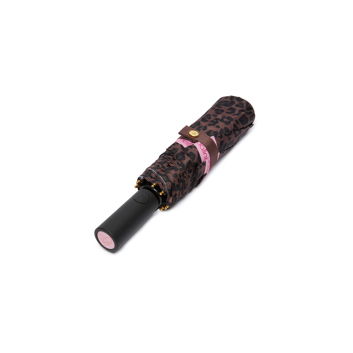 Ombrello manuale dal look grintoso e femminile, caratterizzato da una stampa animalier all-over su base marrone, arricchita da un’esplosione di cuori rosa al centro. Il bordo a contrasto, nei toni del rosa pastello, è decorato con il logo Braccialini per un tocco glamour e riconoscibile. Un accessorio originale e di carattere, perfetto per affrontare la pioggia con stile.