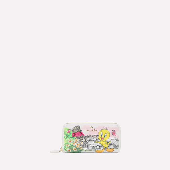 Zaino compatto in similpelle, perfetto per aggiungere un tocco giocoso e vivace al proprio look quotidiano. La stampa, ispirata alla città di Roma, vede protagonista Titti tra margherite in rilievo, farfalle e l’iconico Colosseo. I dettagli glitterati e le applicazioni tridimensionali lo rendono unico e originale. Dotato di spallacci regolabili, manico superiore e comoda chiusura con zip, unisce praticità e stile per chi ama distinguersi con ironia e colore.