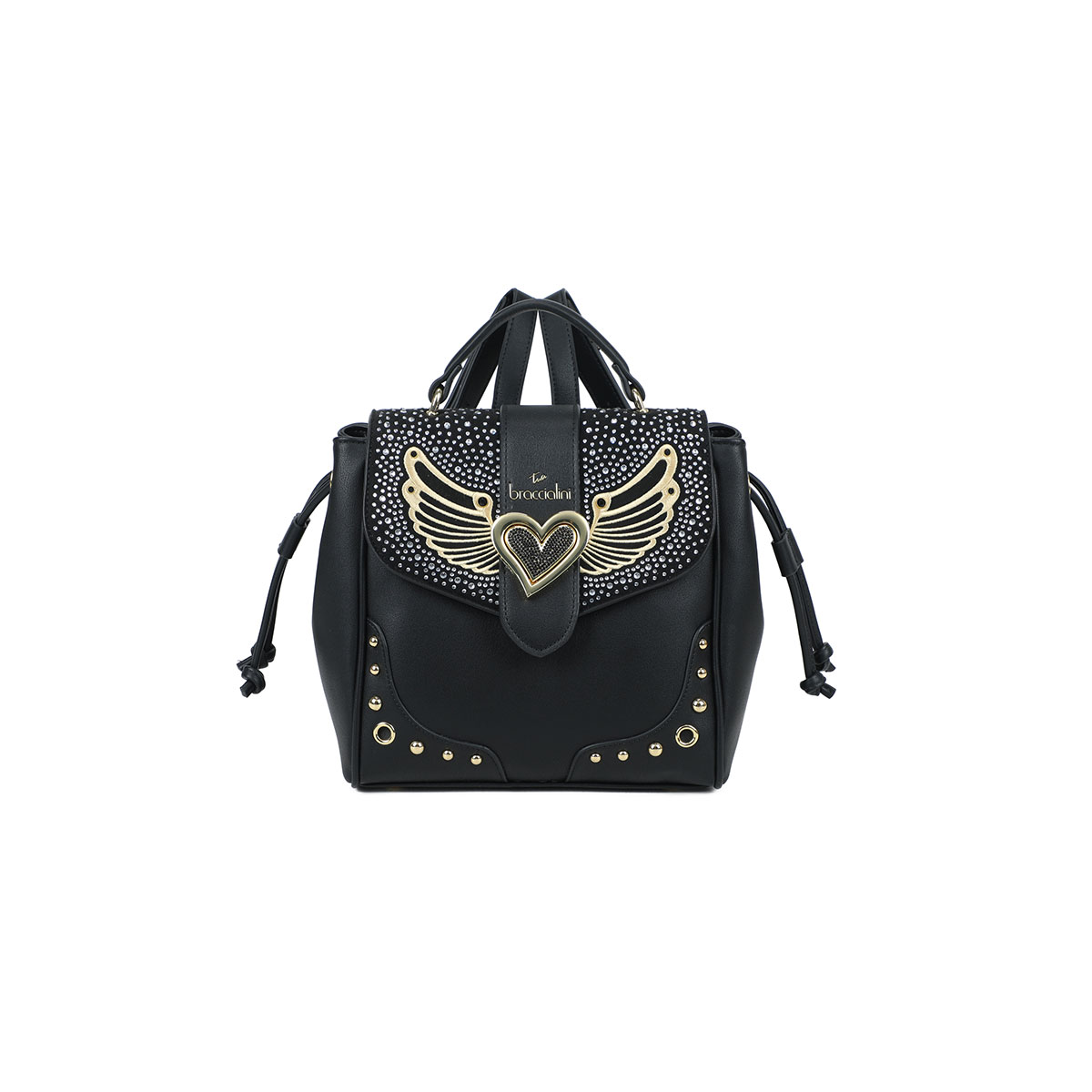 L'intramontabile zaino nero si trasforma in un manifesto di stile audace. Questa creazione è caratterizzata da una scenografica 'pioggia' di borchie e punti luce che scintillano su una base total black, richiamando l'energia delle luci metropolitane. Al centro, l'accessorio metallico a forma di cuore sigilla il design, donando un carattere rock-glamour a un accessorio pensato per chi non vuole passare inosservato, nemmeno dopo il tramonto