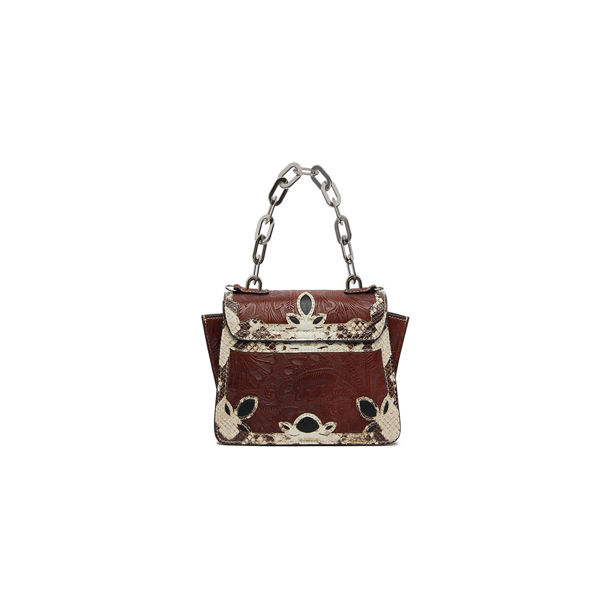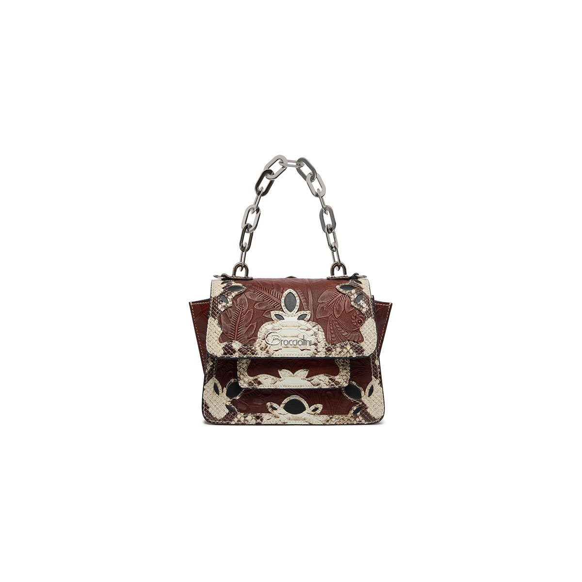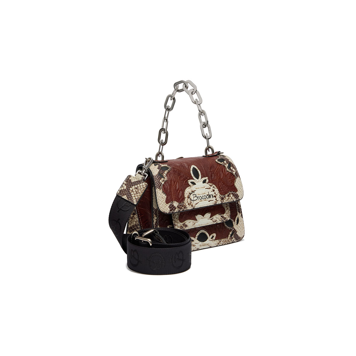 Borsa compatta e grintosa, dal design geometrico ed essenziale. Le due pattine sovrapposte custodiscono con eleganza un doppio accesso tasca, rendendola pratica e raffinata. La maniglia in maxi catena logata e la tracolla removibile aggiungono un tocco deciso. L’intarsio in pelle effetto pitone, abbinato al cuoio lavorato nei toni del marrone e nero, rievoca uno stile texano contemporaneo, ricercato e d’impatto. |