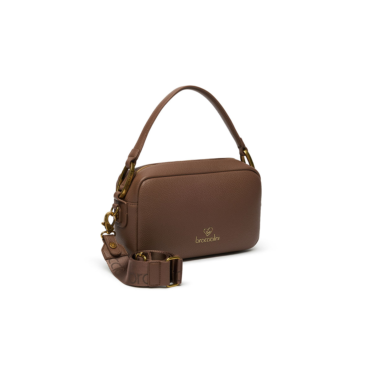 Borsa a tracolla in similpelle di colore marrone, il design è valorizzato da una catena dorata removibile con maxi maglie che aggiunge un tocco glamour e distintivo, inoltre è dotata di un manico liscio in similpelle così da intercambiarli per uno stile versatile e moderno. Presenta anche una tracolla logata regolabile e removibile che ne permette la doppia portabilità. L'interno, foderato in tessuto animalier, nasconde un’anima grintosa e raffinata. |