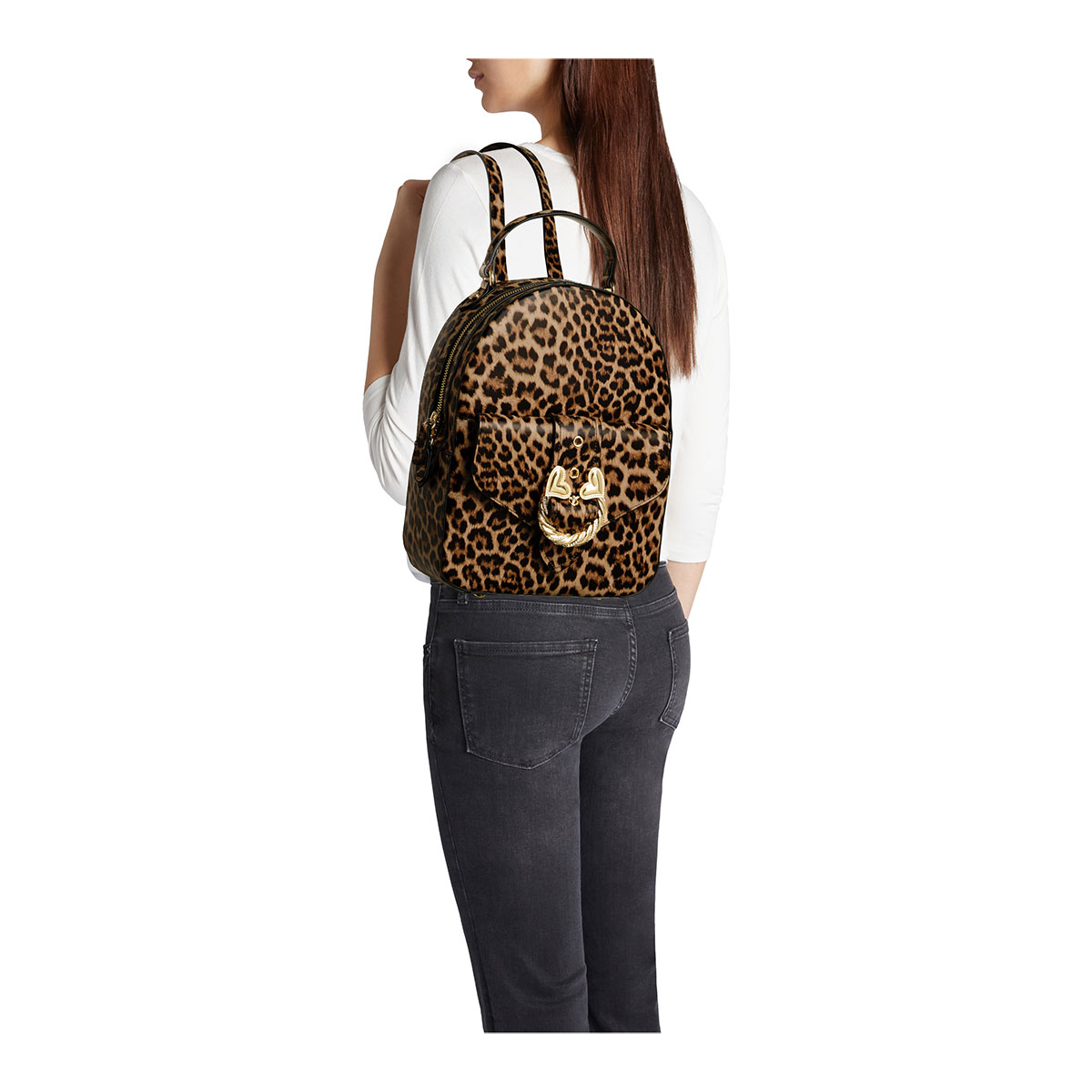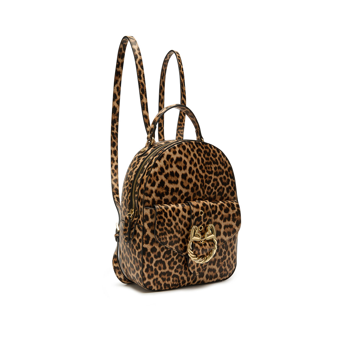 Zaino in pelle con stampa leopardata dal design semi strutturato e femminile. L'accessorio gioiello dorato a forma di torchon con cuori è protagonista assoluto, conferendo un tocco romantico e scenografico. Comodo e raffinato, è dotato di spallacci regolabili e manico superiore.