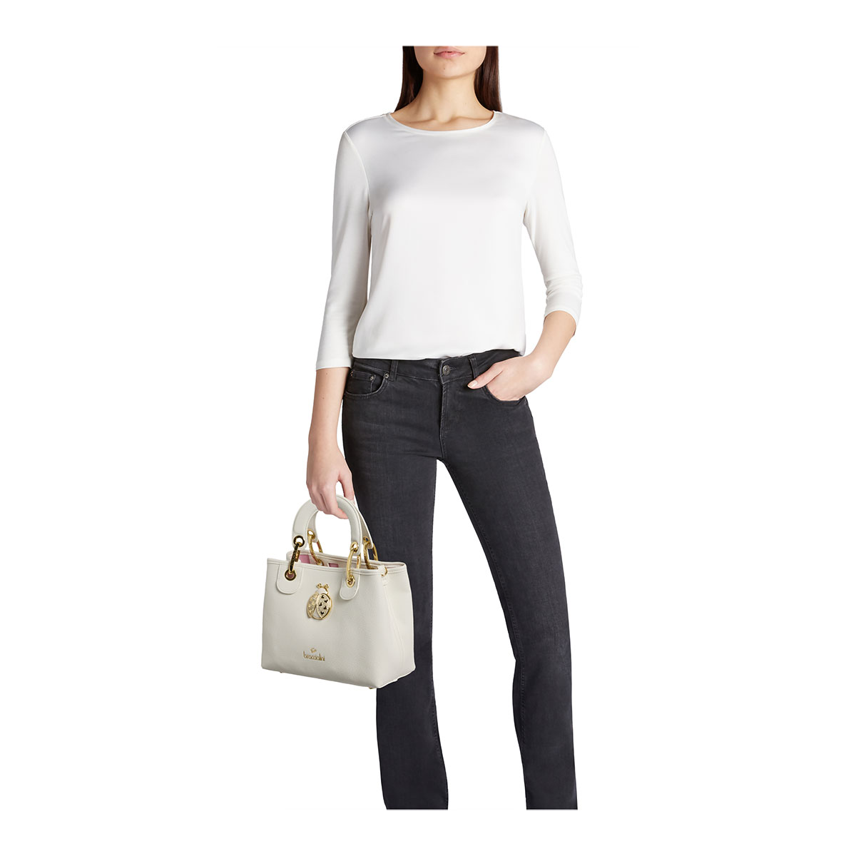 Borsa a mano di medie dimensioni in colore bianco, con doppi manici e tracolla logata removibile e regolabile per una doppia portabilità. All’interno, una pochette estraibile utilizzabile come seconda borsa. Il design è impreziosito da un’elegante coccinella gioiello, simbolo di fortuna e stile.