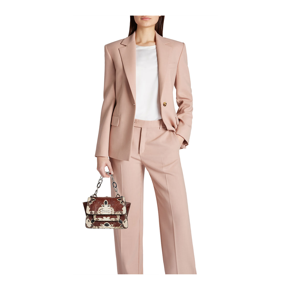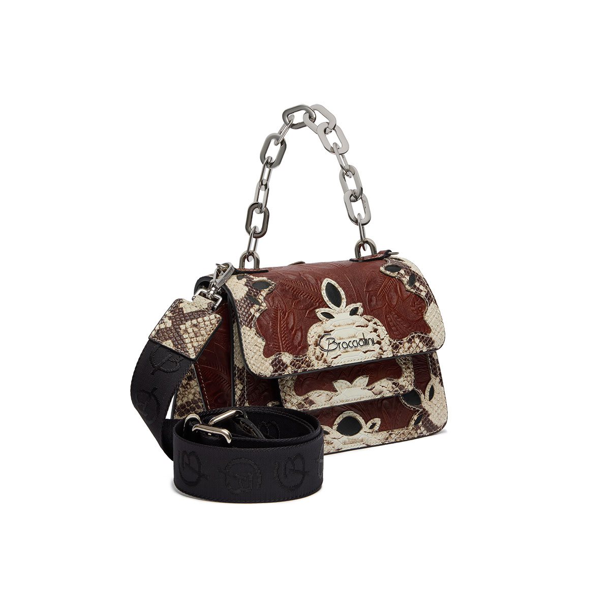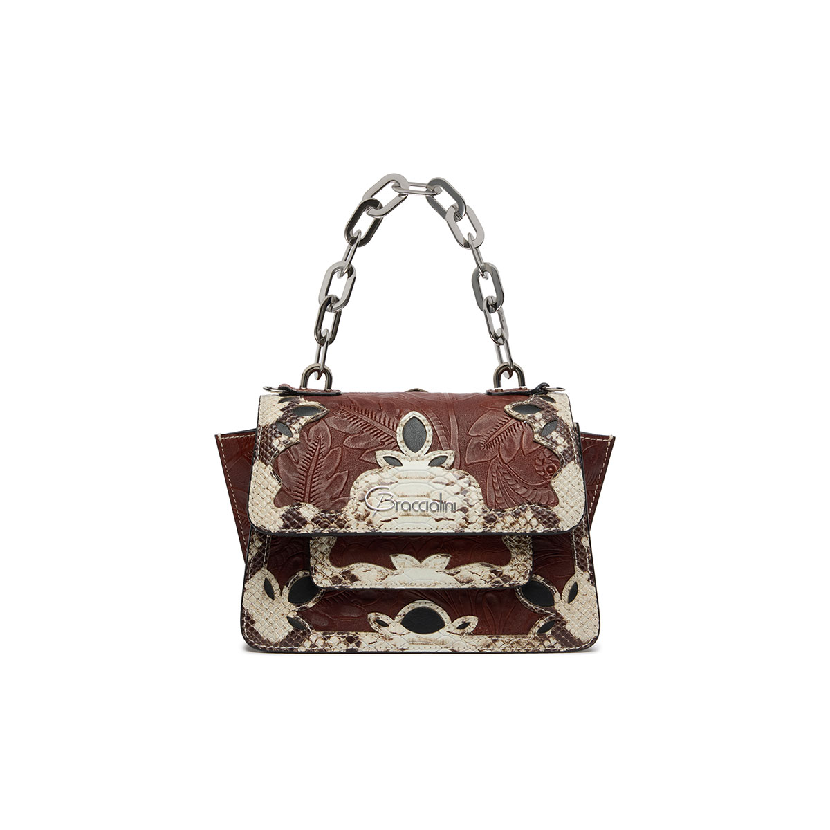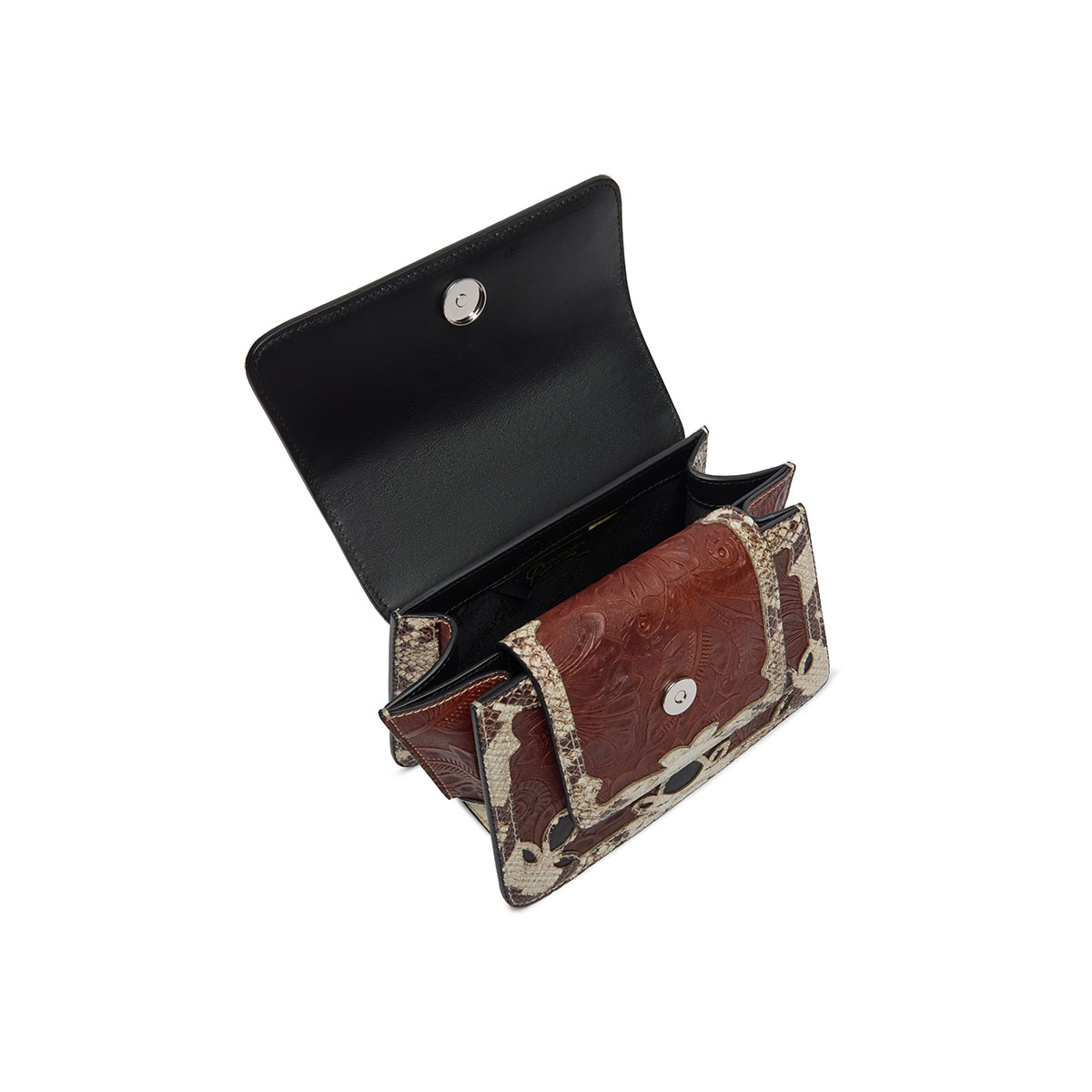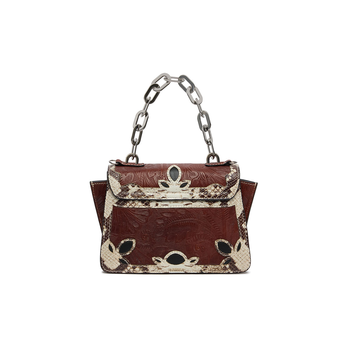 Borsa compatta e grintosa, dal design geometrico ed essenziale. Le due pattine sovrapposte custodiscono con eleganza un doppio accesso tasca, rendendola pratica e raffinata. La maniglia in maxi catena logata e la tracolla removibile aggiungono un tocco deciso. L’intarsio in pelle effetto pitone, abbinato al cuoio lavorato nei toni del marrone e nero, rievoca uno stile texano contemporaneo, ricercato e d’impatto. |