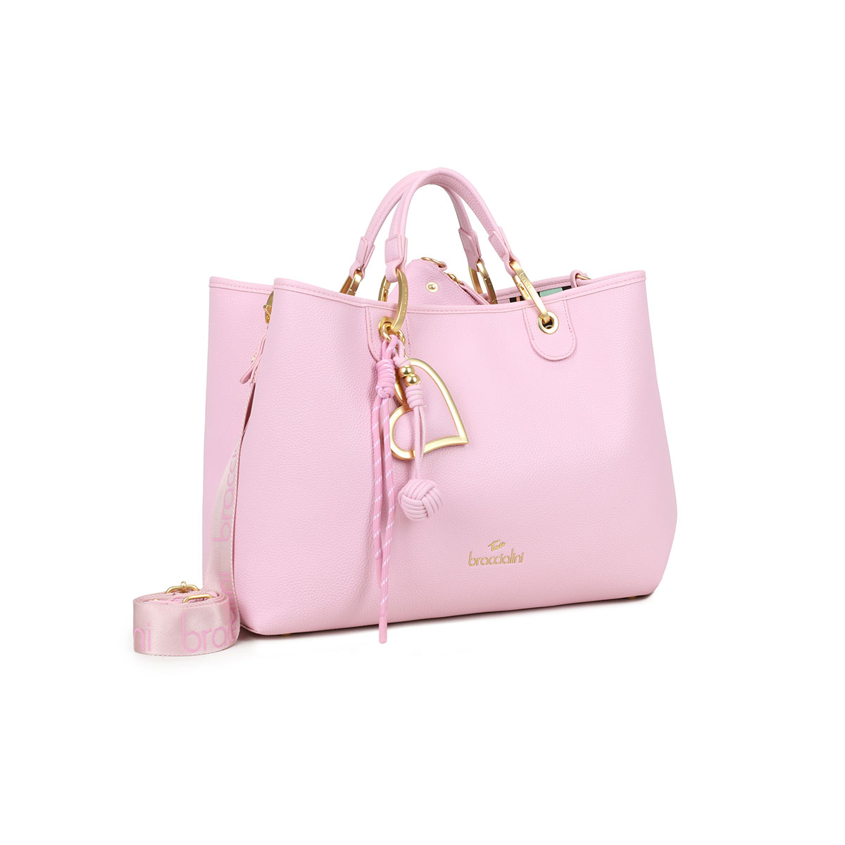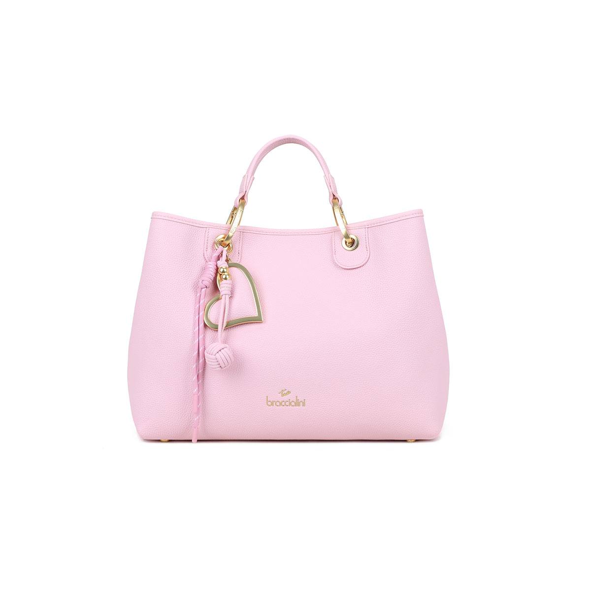 Borsa a mano grande in similpelle dal design capiente e raffinato. Dotata di doppi manici e tracolla logata regolabile e removibile, offre una doppia portabilità per un uso quotidiano versatile. L'interno ospita una comoda pochette estraibile con zip, perfetta per essere utilizzata come seconda borsa. Il maxi-charm removibile a multifilo con cuore dorato satinato, in tinta con la borsa, aggiunge un tocco distintivo e iconico.