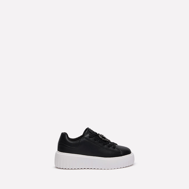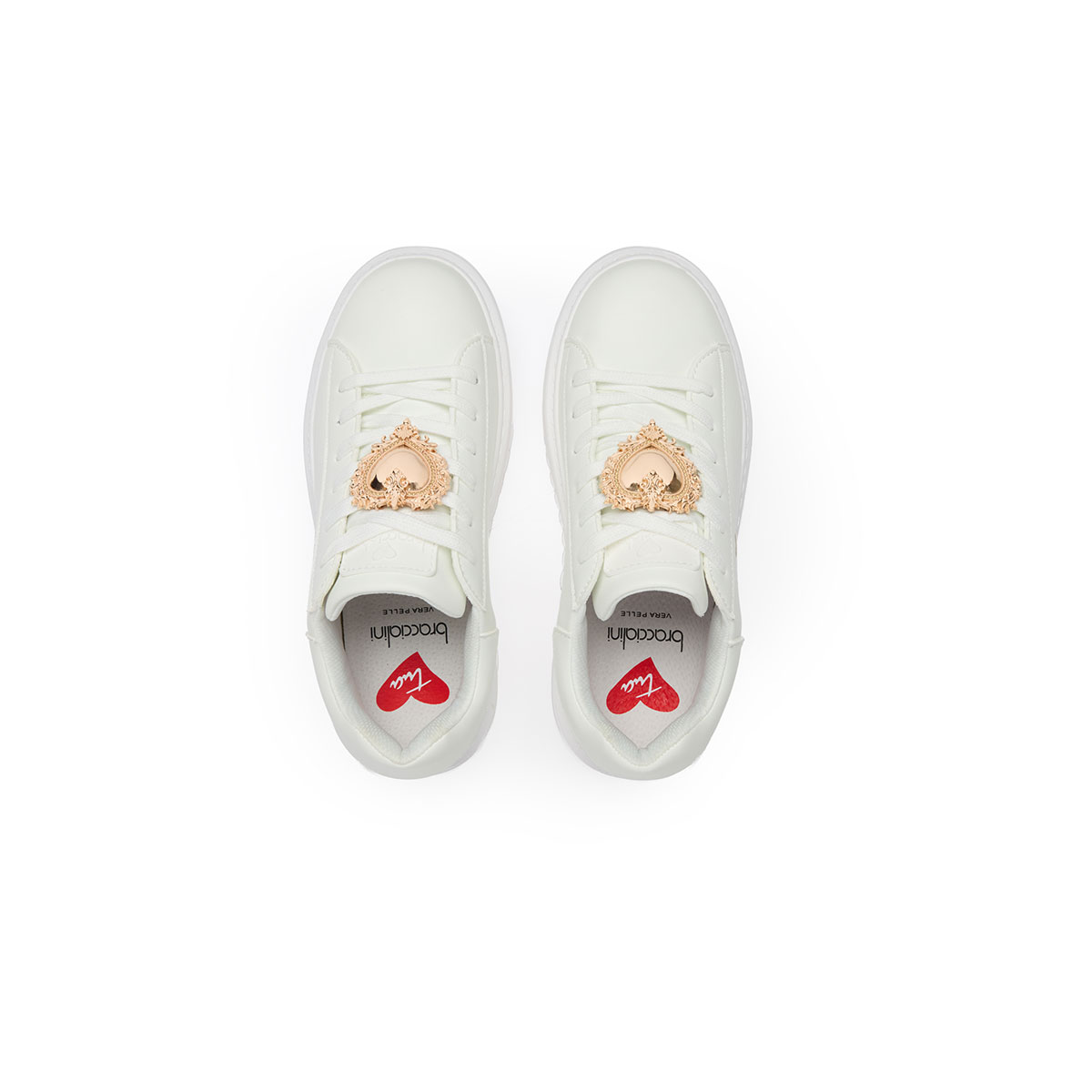 Comoda sneakers con soletta in pelle, base in tinta unita bianca con dettaglio logo laterale di colore oro; lucenti accessori dorati removibili che ne decorano le stringhe. Suola platform in gomma bianca. |