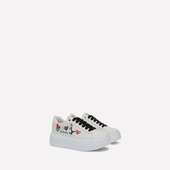 Comoda sneakers con soletta in pelle, base in tinta unita bianca con dettaglio logo laterale di colore oro; lucenti accessori dorati removibili che ne decorano le stringhe. Suola platform in gomma bianca.