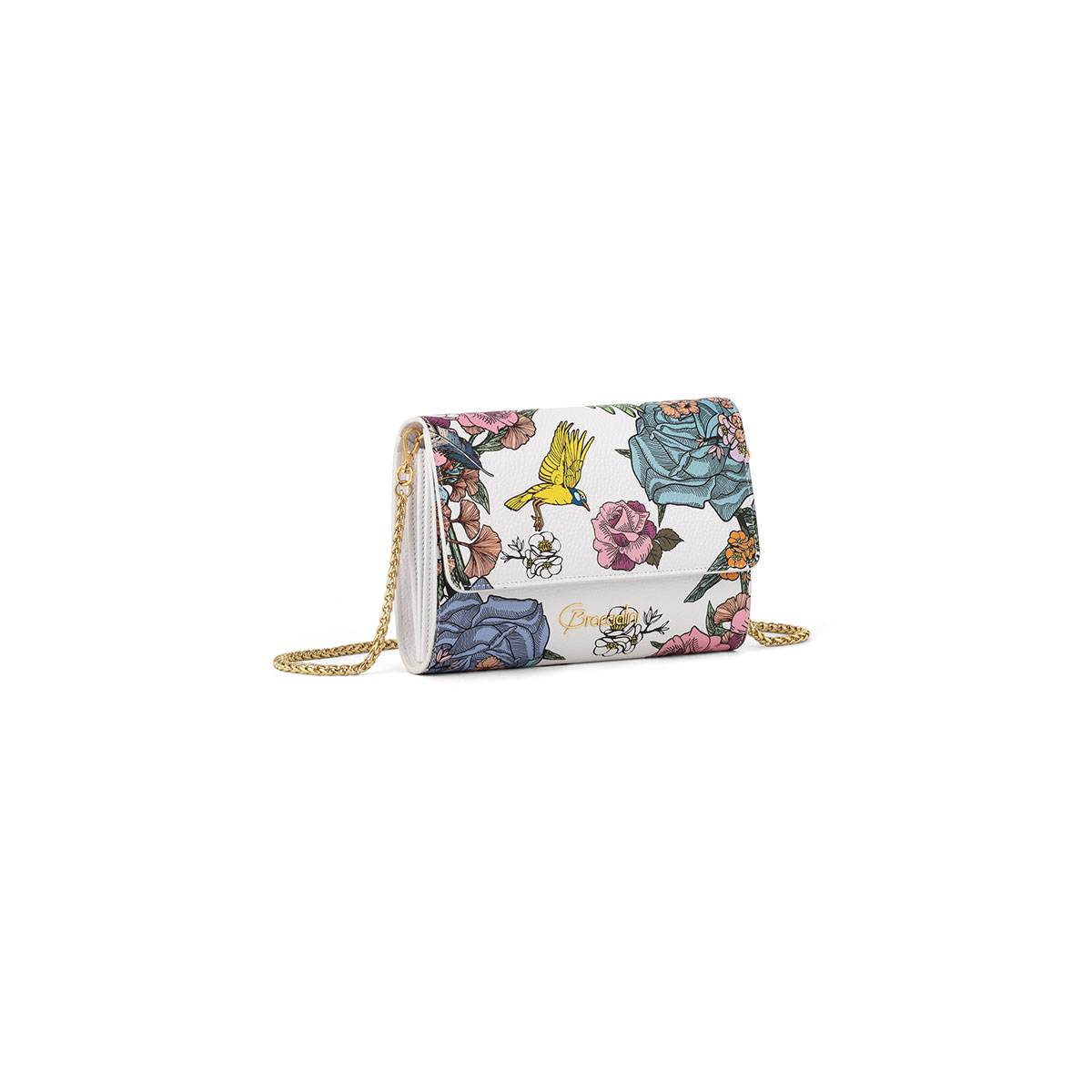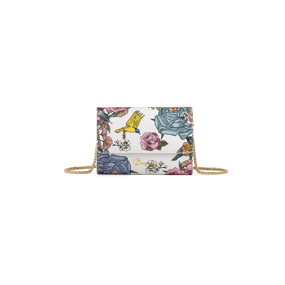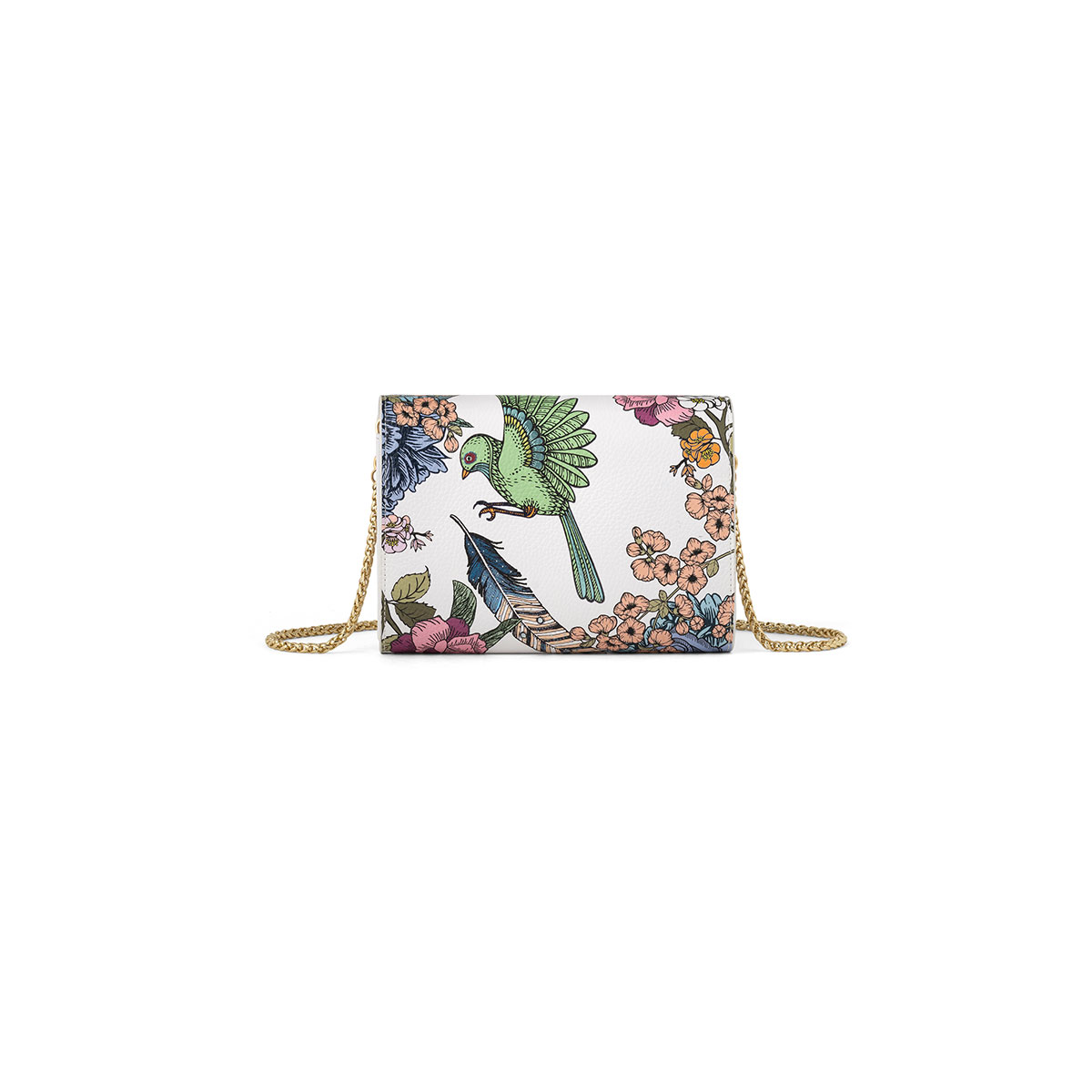 Pochette lussuosa che funge anche da maxi portafoglio, divisa internamente in scomparti e soffietti chiusi da zip. La stampa multicolore, realizzata in pelle dollarino, rappresenta uccellini variopinti alternati a fiori delicati, con piccoli dettagli in rilievo. La tracolla removibile è a catena lavorata a maglia cilindrica.