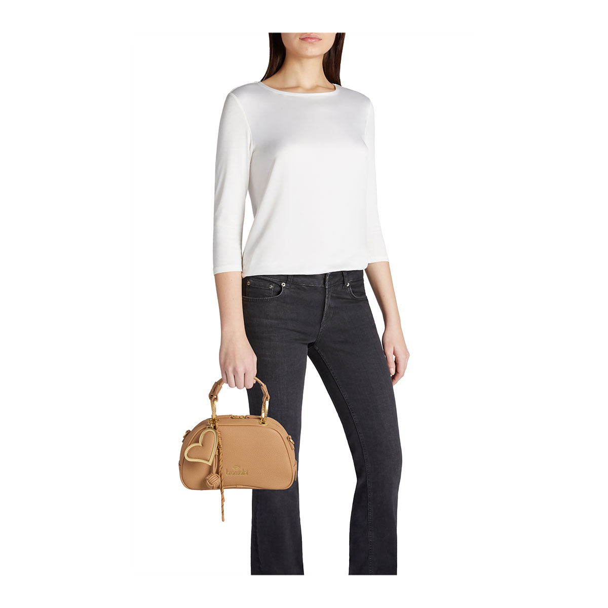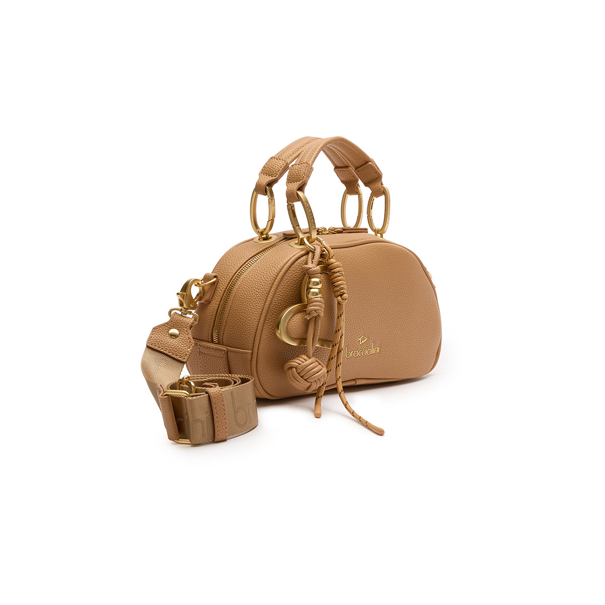 Bauletto piccolo in simil pelle color biscotto, dalle linee arrotondate e compatte. Dotato di doppi manici e tracolla logata regolabile e removibile per una doppia portabilità, unisce praticità e stile. A caratterizzare il modello, un maxi-charm decorativo a forma di cuore con fili e perle assortite, che dona un tocco originale e giocoso al design essenziale. Il logo Braccialini frontale e i dettagli dorati completano con eleganza questo accessorio dallo spirito moderno e sofisticato.
