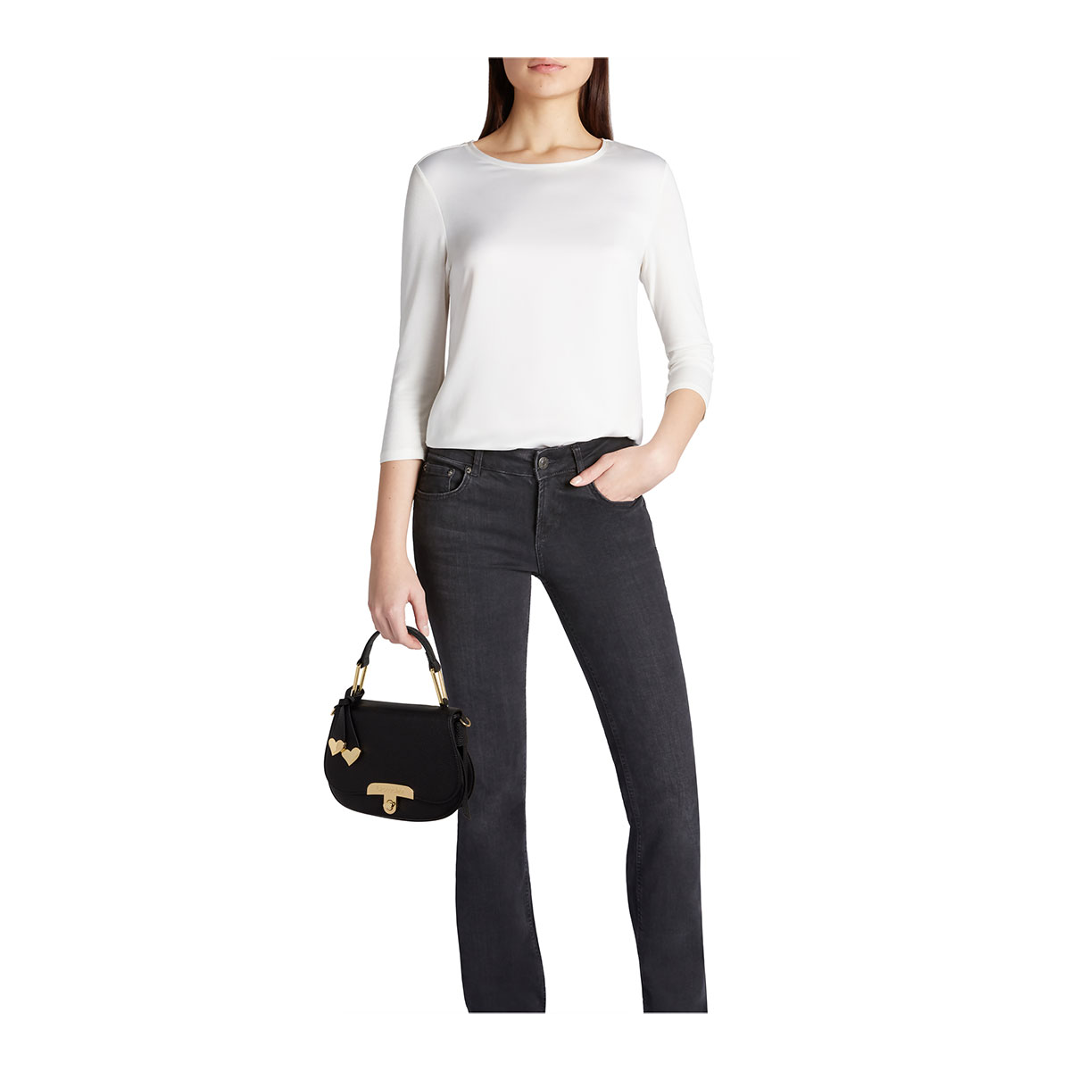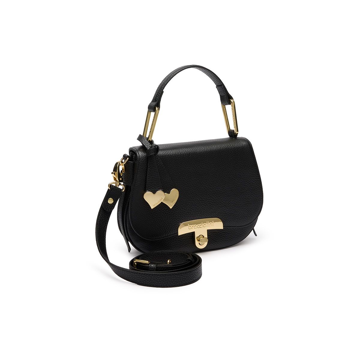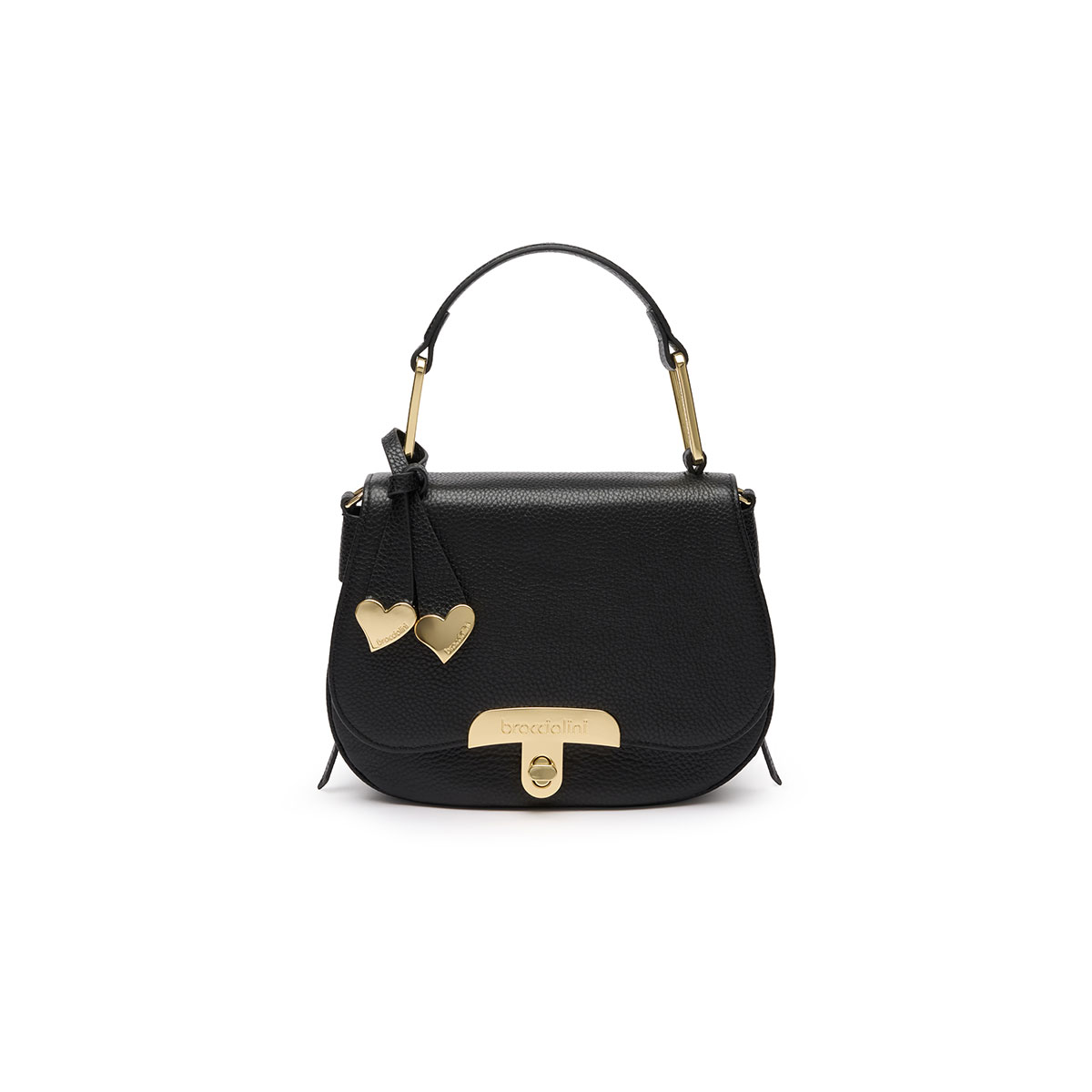 Borsa a mano in morbida pelle di colore nero, dal design compatto e sofisticato. La forma arrotondata con patta frontale è impreziosita da una chiusura girello dorata con logo Braccialini inciso. Dotata di un manico con dettagli in metallo e tracolla regolabile e removibile, offre una doppia portabilità: a mano o crossbody. Un raffinato charm in pelle con dettagli metallici dorati a forma di cuoricino aggiunge un tocco romantico e distintivo. Elegante e funzionale, è ideale per completare look da giorno e da sera con stile senza tempo.