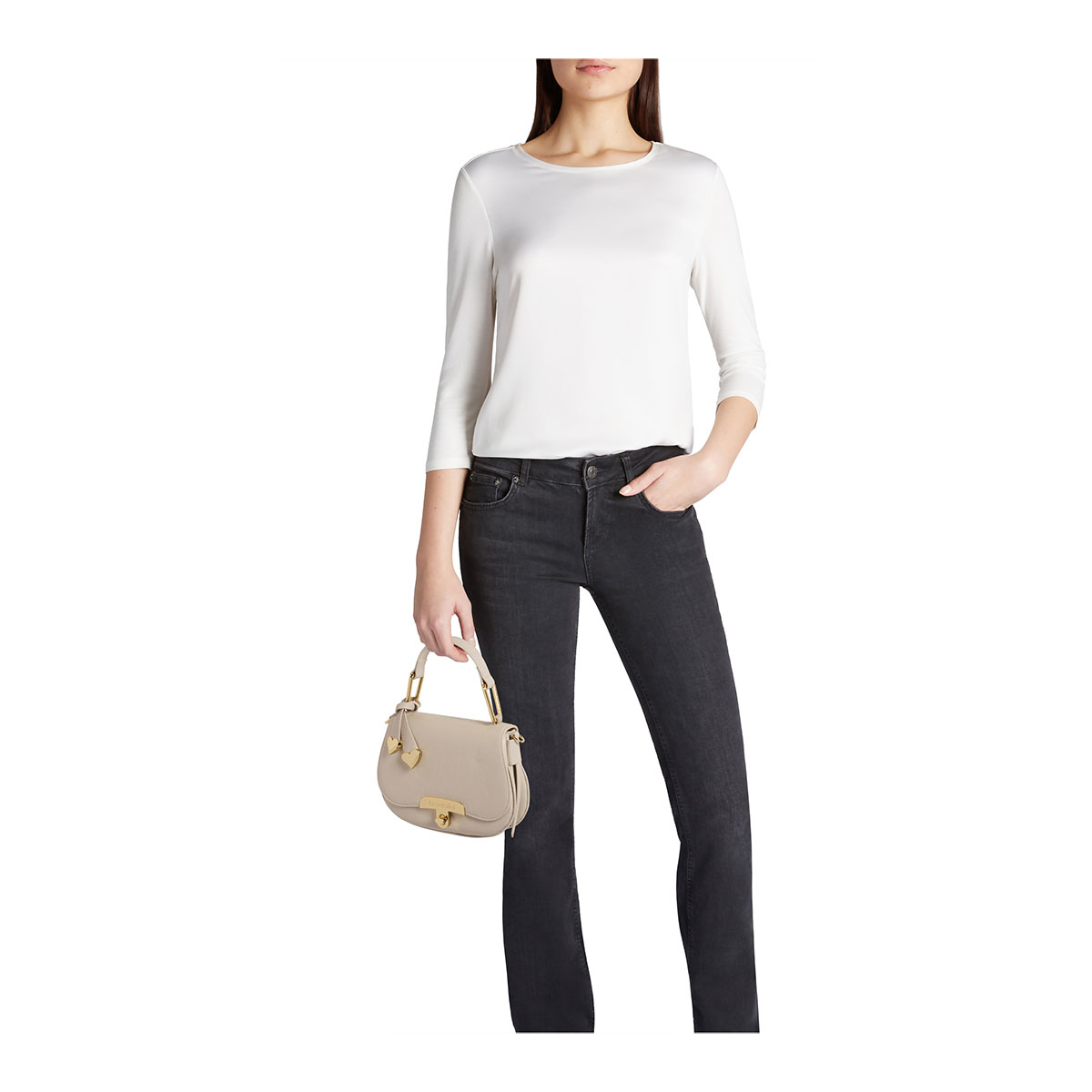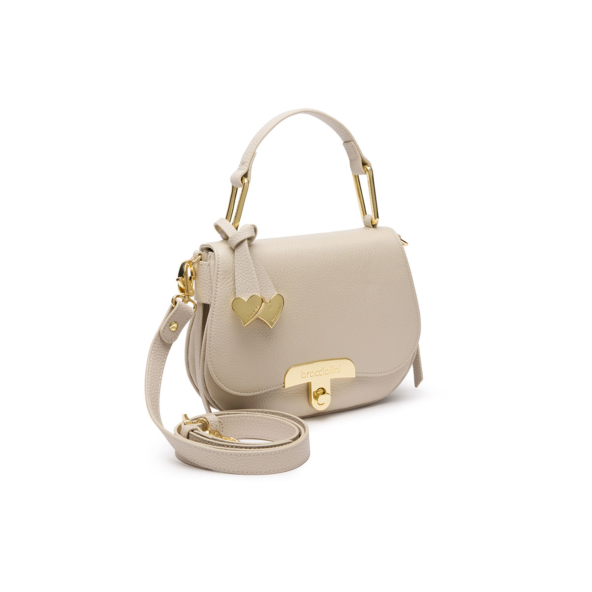 Borsa a mano in morbida pelle di colore grigio, dal design compatto e sofisticato. La forma arrotondata con patta frontale è impreziosita da una chiusura girello dorata con logo Braccialini inciso. Dotata di un manico con dettagli in metallo e tracolla regolabile e removibile, offre una doppia portabilità: a mano o crossbody. Un raffinato charm in pelle con dettagli metallici dorati a forma di cuoricino aggiunge un tocco romantico e distintivo. Elegante e funzionale, è ideale per completare look da giorno e da sera con stile senza tempo.