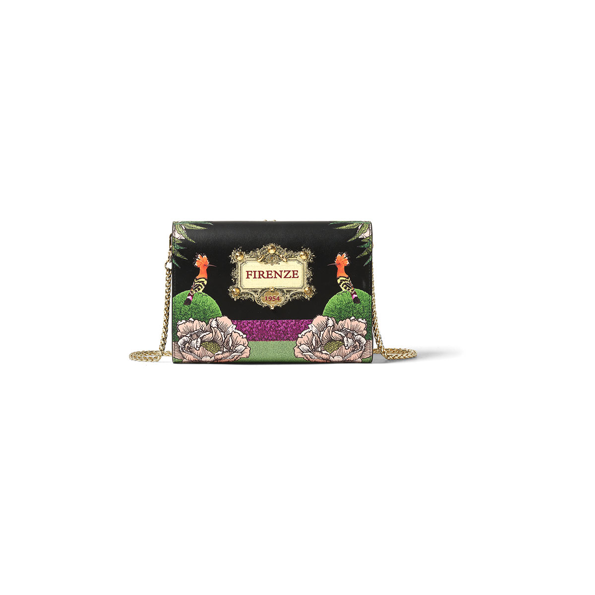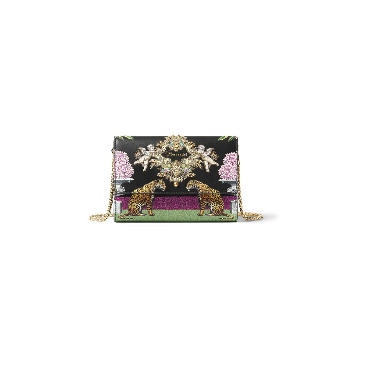 Una clutch sofisticata ma eccentrica, la tracolla in catena dorata e l\’accessorio metallico centrale la rendono un gioiello a cui non poter rinunciare, ideale per ogni occasione. La struttura interna a scompartimenti e la fodera in contrasto ne enfatizzano il gusto moda. |