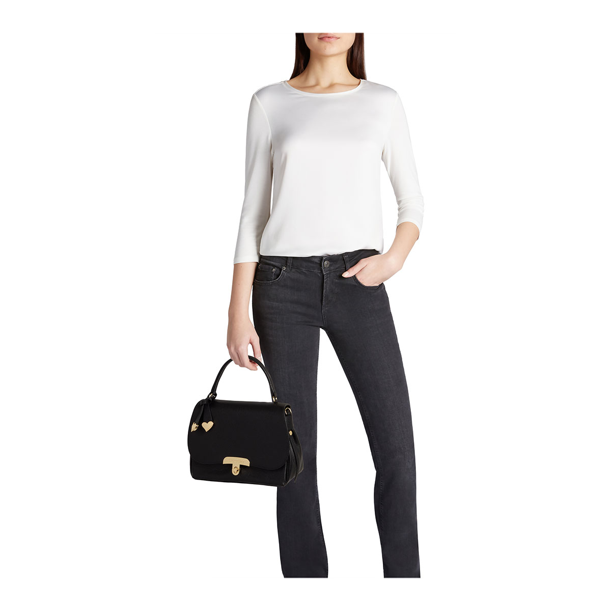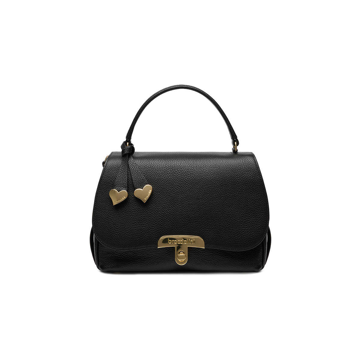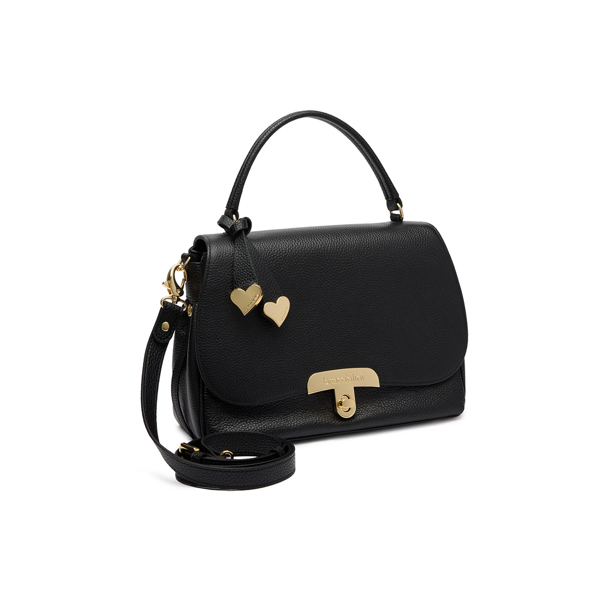 Borsa a mano di medie dimensioni in morbida pelle di colore nero, dal design elegante e minimale. La struttura rigida con patta frontale è impreziosita da una chiusura girello dorata con logo inciso. Dotata di manico superiore e tracolla regolabile e removibile, offre una doppia portabilità, a mano o a spalla. Un accessorio raffinato e versatile, ideale per accompagnare ogni look con discreta eleganza. Completano il design un ciondolo in pelle con elementi in metallo a forma di cuoricino, per un tocco romantico e distintivo.