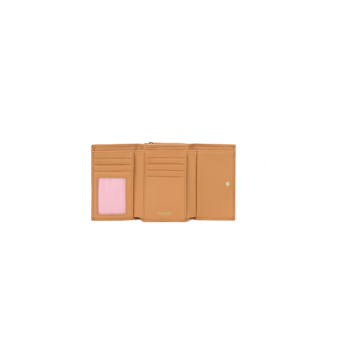 Portafoglio modello continental medio, in pelle di colore biscotto con la logatura in rilievo dorata.