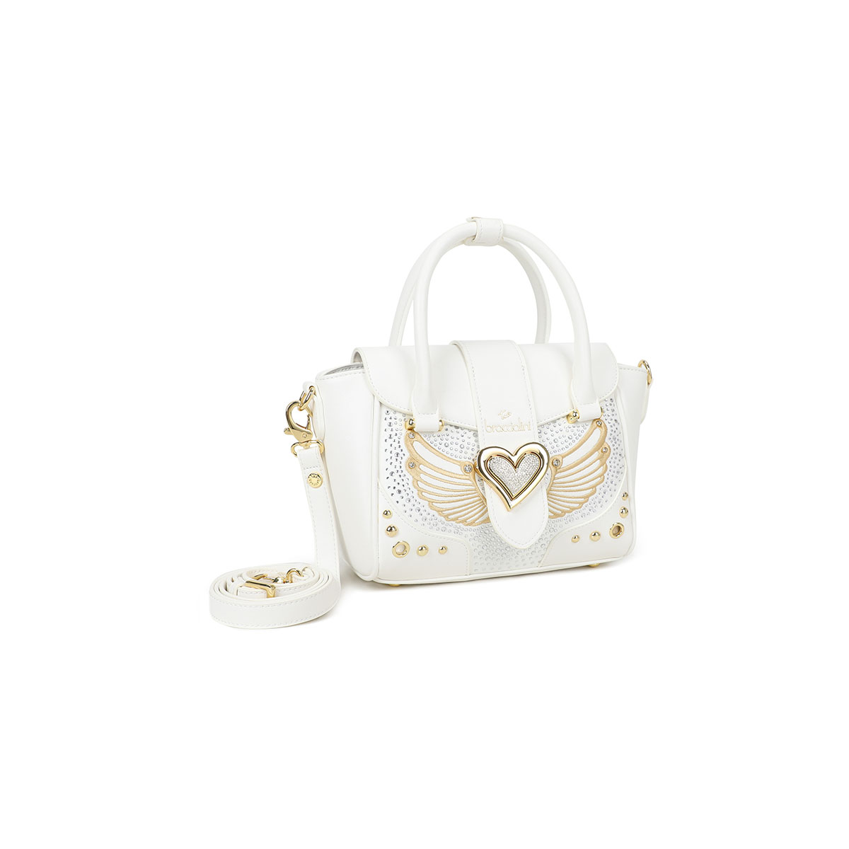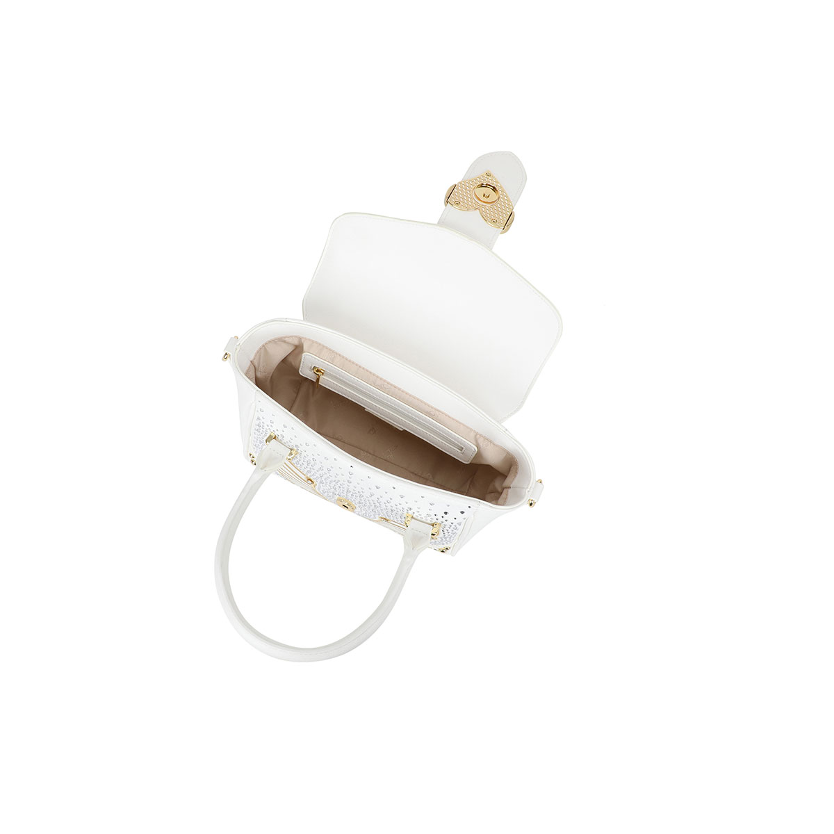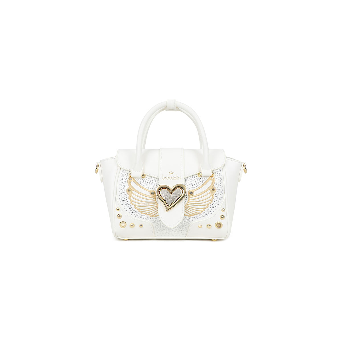 L'intramontabile borsa a mano bianca si trasforma in un manifesto di stile audace. Questa creazione è caratterizzata da una scenografica 'pioggia' di borchie e punti luce che scintillano su una total white, richiamando l'energia delle luci metropolitane. Al centro, l'accessorio metallico a forma di cuore sigilla il design, donando un carattere rock-glamour a un accessorio pensato per chi non vuole passare inosservato, nemmeno dopo il tramonto