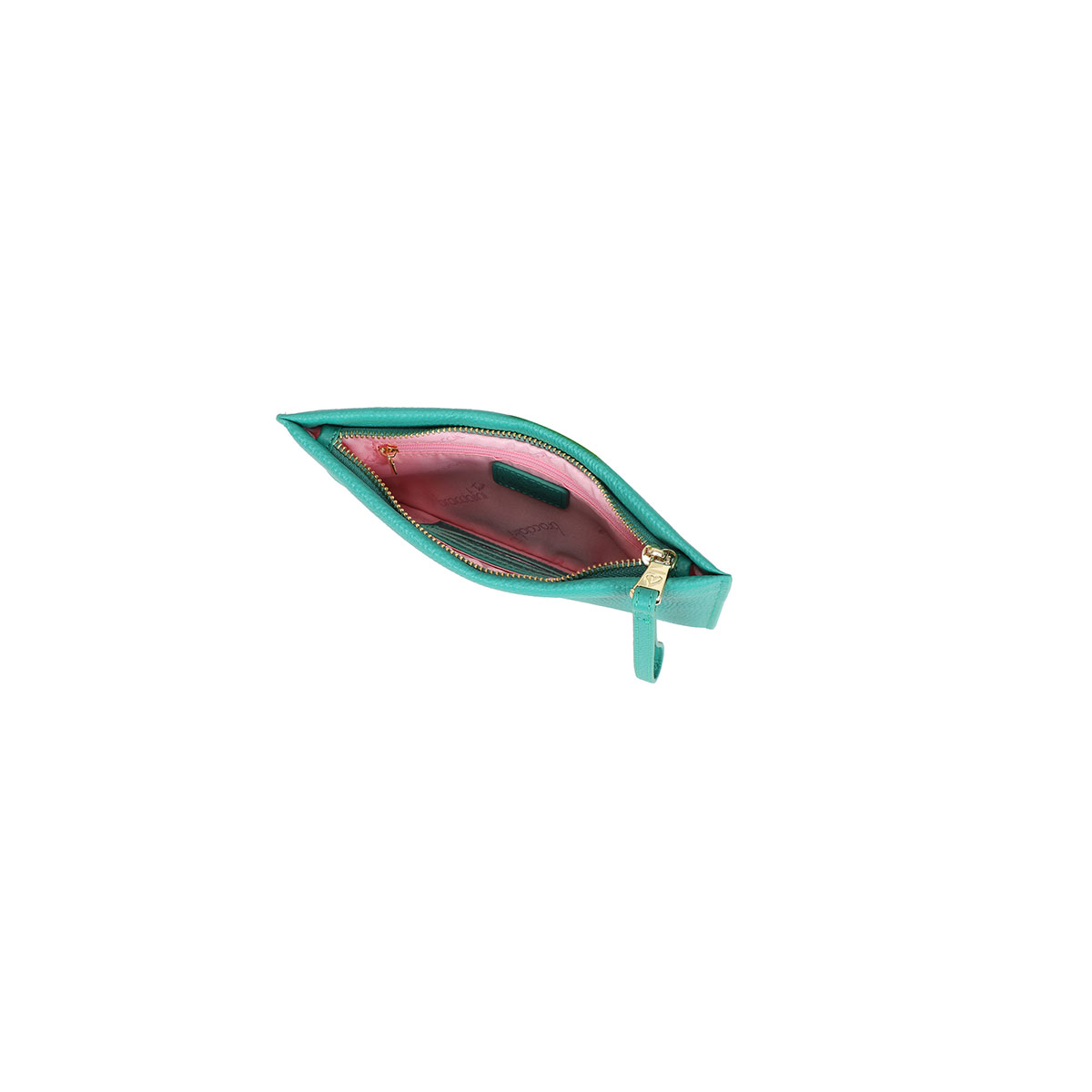 Bustina piatta piccola in pelle color smeraldo dal design essenziale e intramontabile. Caratterizzata da una pratica chiusura con zip dorata e laccetto laterale, è impreziosita dal logo Braccialini applicato su placca dorata frontale. Compatta ma capiente, è ideale per custodire con stile gli oggetti indispensabili, sia all'interno di una borsa più grande che portata a mano. Un accessorio pratico e raffinato, perfetto per accompagnarti con eleganza in ogni momento della giornata.