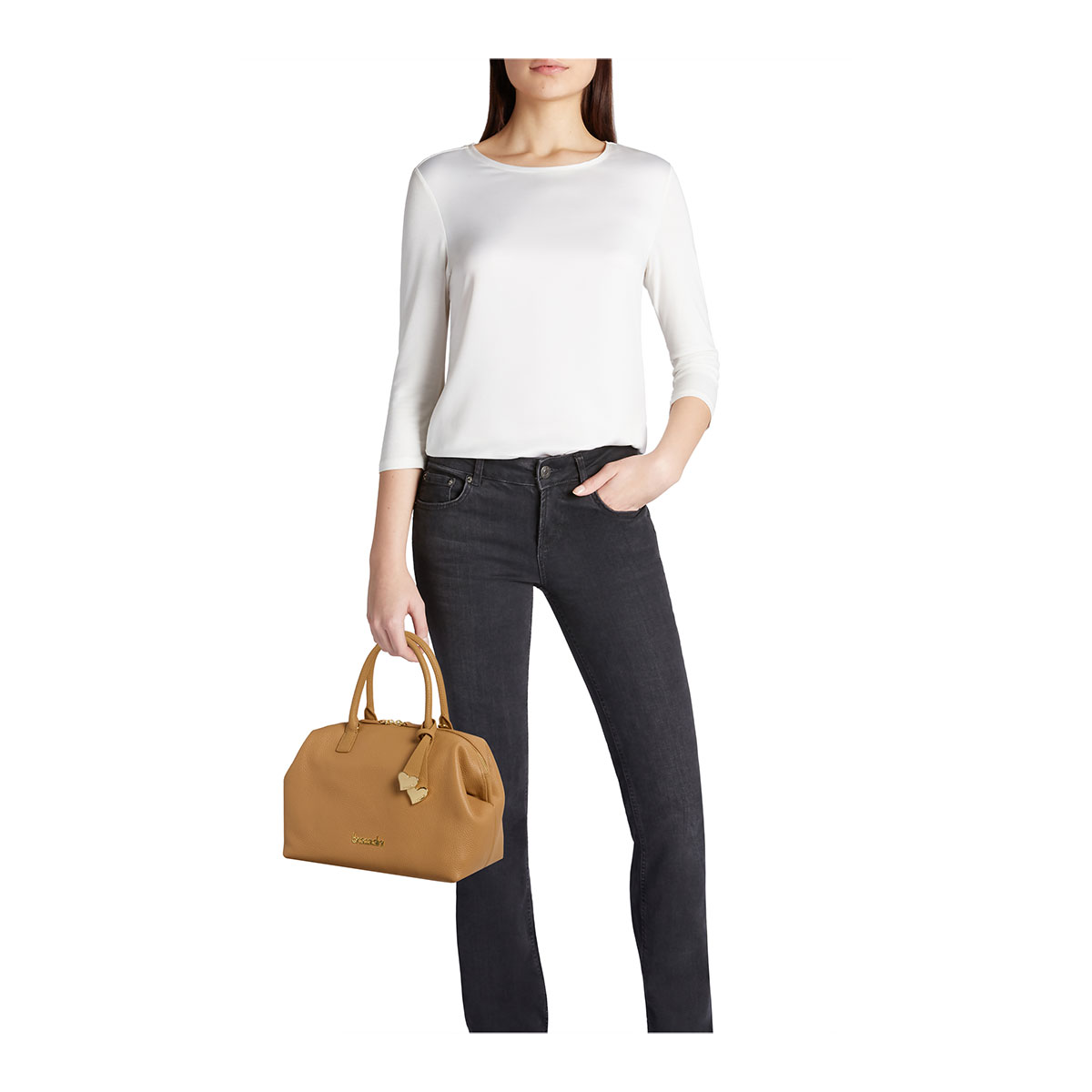 Bauletto in pelle in colore biscotto, con doppi manici e tracolla removibile e regolabile per una doppia portabilità. Dotata di chiusura con doppia zip in metallo dorato, presenta un design pulito e strutturato, ideale per l’uso quotidiano. Un modello essenziale e raffinato, perfetto per chi cerca praticità senza rinunciare all’eleganza. Completano il look un ciondolo in pelle con elementi in metallo dorato a forma di cuoricino, per un tocco romantico e distintivo.