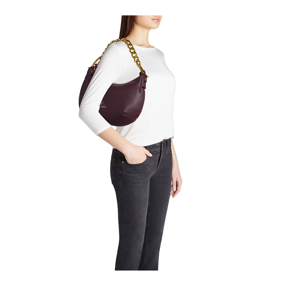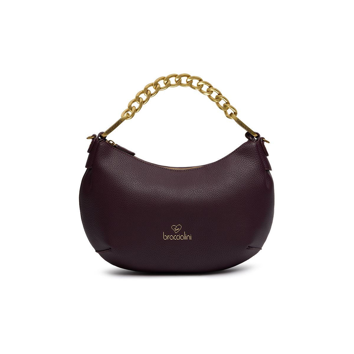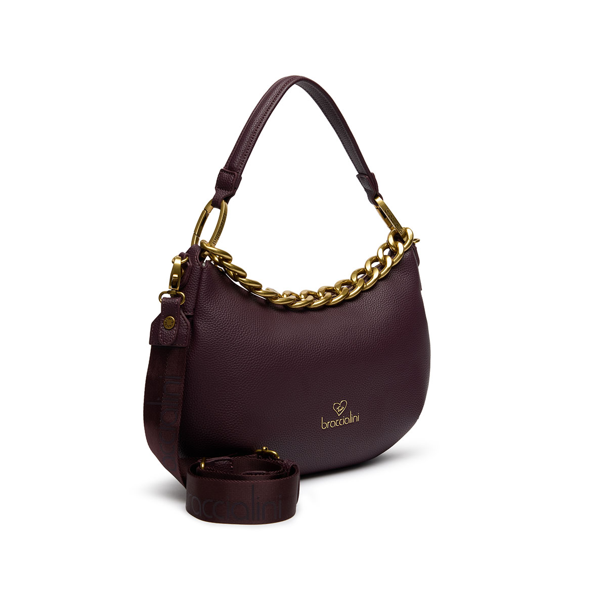 Borsa hobo in colore bordeaux, con manico singolo e tracolla logata removibile e regolabile per una doppia portabilità. All’interno, una pochette estraibile utilizzabile come seconda borsa. Il design è valorizzato da una catena dorata removibile con maxi maglie, che aggiunge un tocco glamour e distintivo. |
