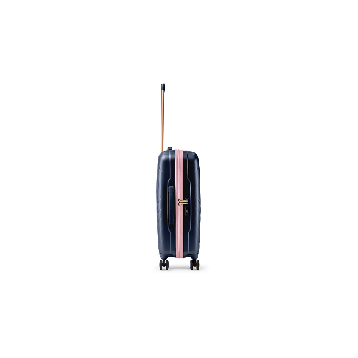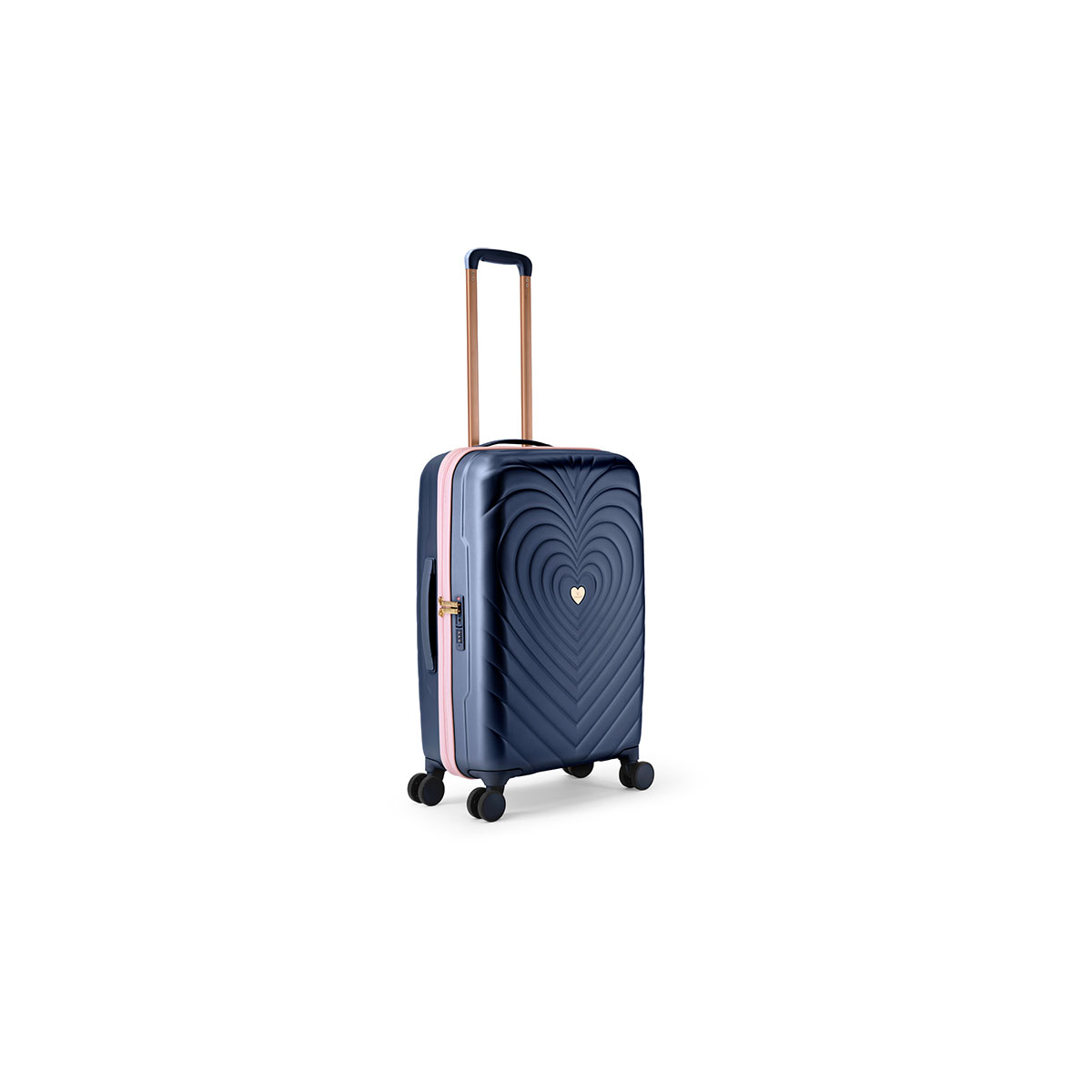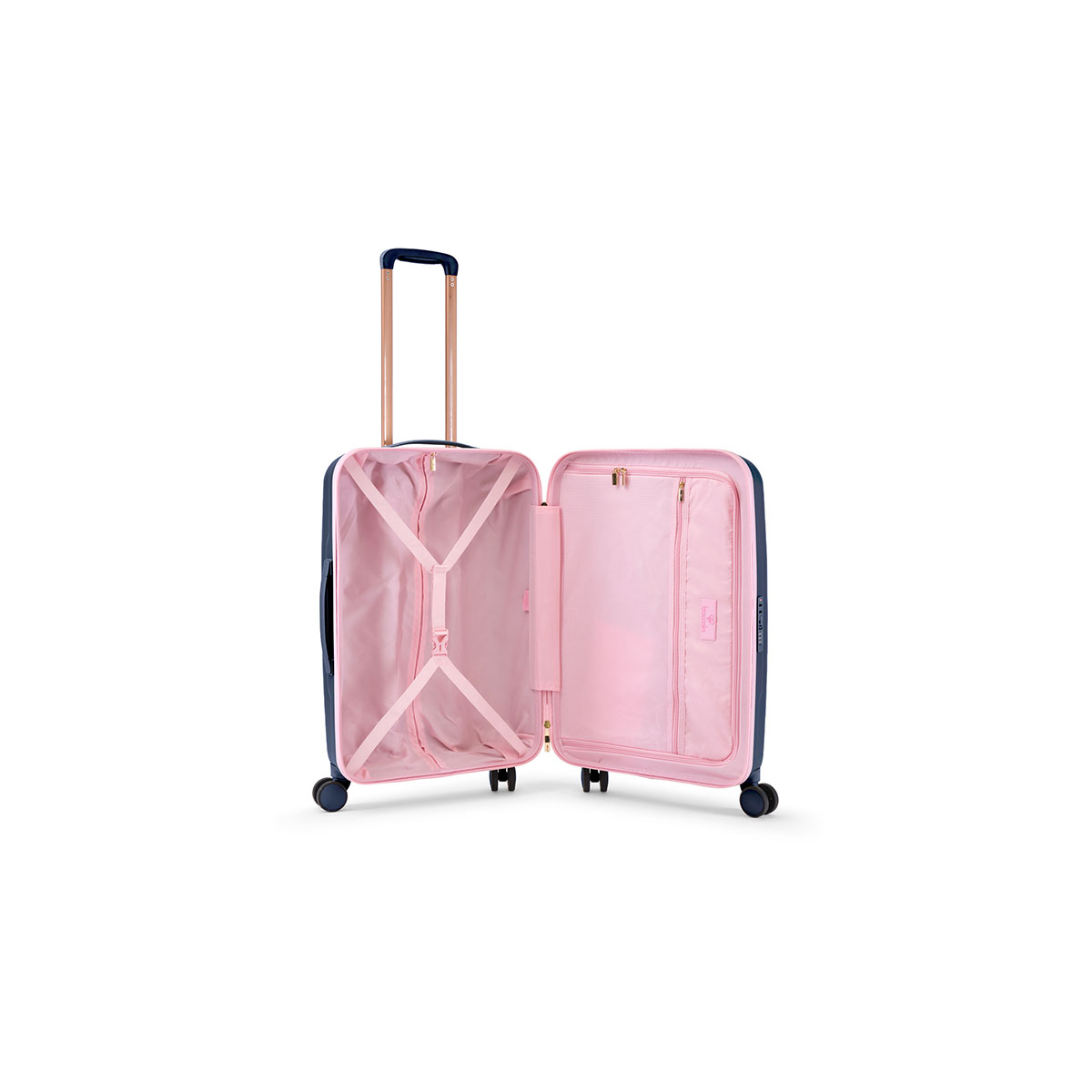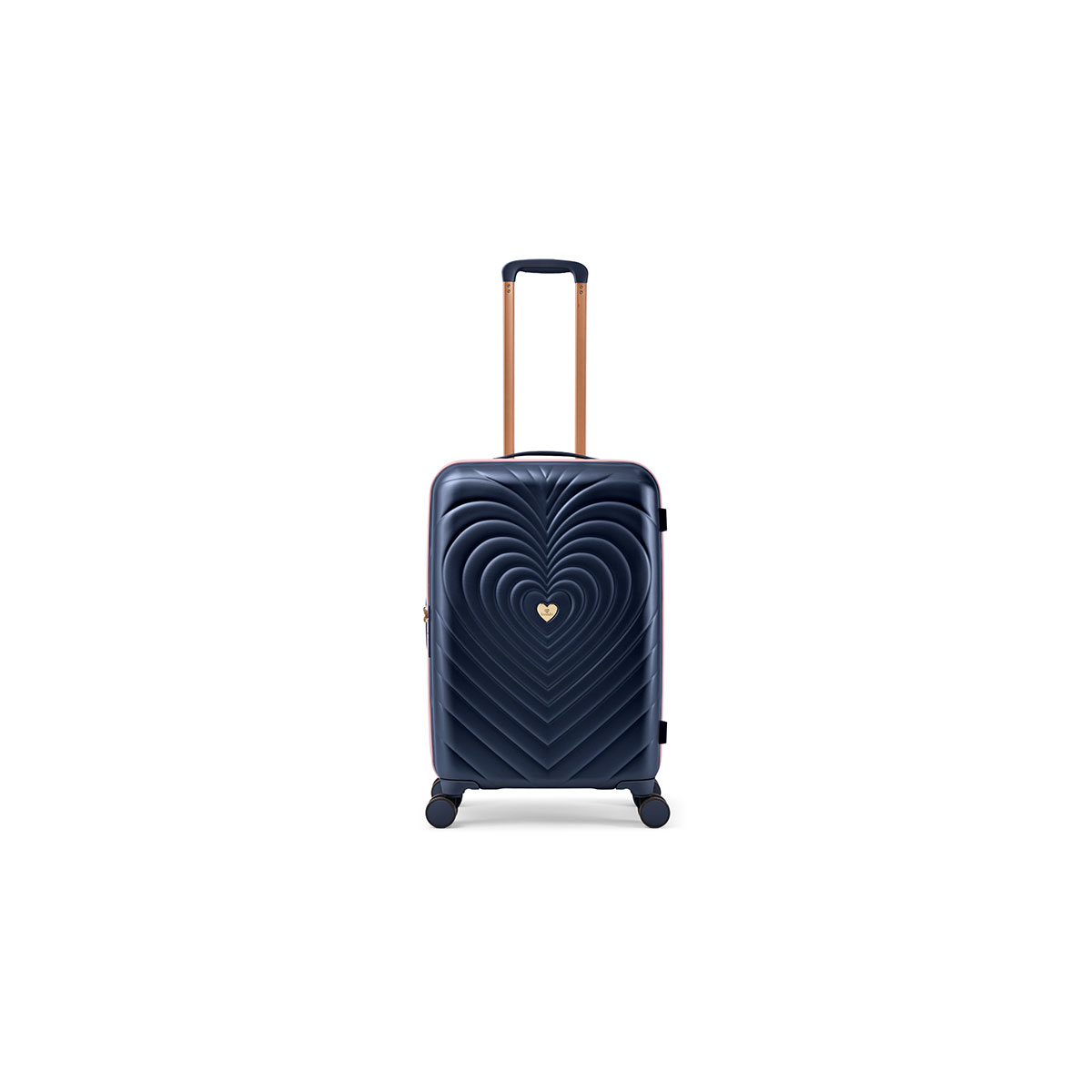 Viaggia con stile con il trolley medio rigido Braccialini, un accessorio raffinato e pratico per chi ama distinguersi. Il design blu sofisticato è impreziosito da una lavorazione a rilievo con motivo a cuore che dona volume, carattere e un tocco romantico all’intera silhouette. La chiusura piatta a combinazione con TSA e la zip espandibile assicurano praticità e sicurezza. Il manico telescopico regolabile con dettagli rosa aggiunge femminilità, così come le quattro ruote multidirezionali con rotazione a 360° che garantiscono un trasporto fluido. Gli interni, funzionali e ben organizzati, includono doppio divisorio ed elastici ferma abiti per ridurre pieghe e mantenere tutto in ordine. Completa il look il luggage tag a cuore in gomma rosa e la sacca riponi valigia coordinata.
