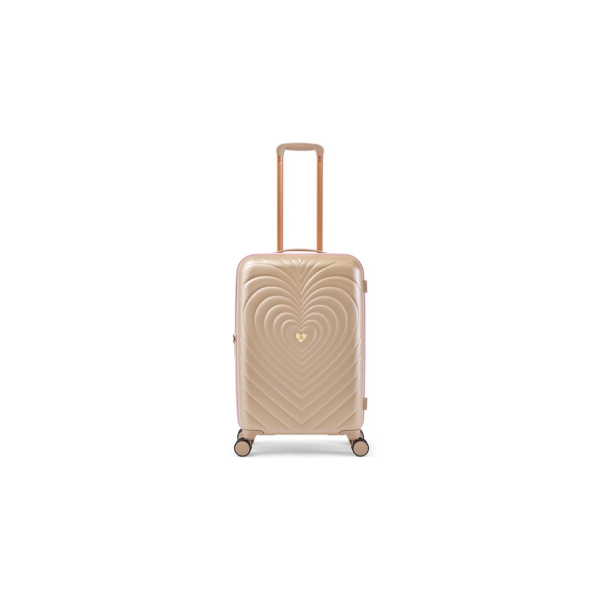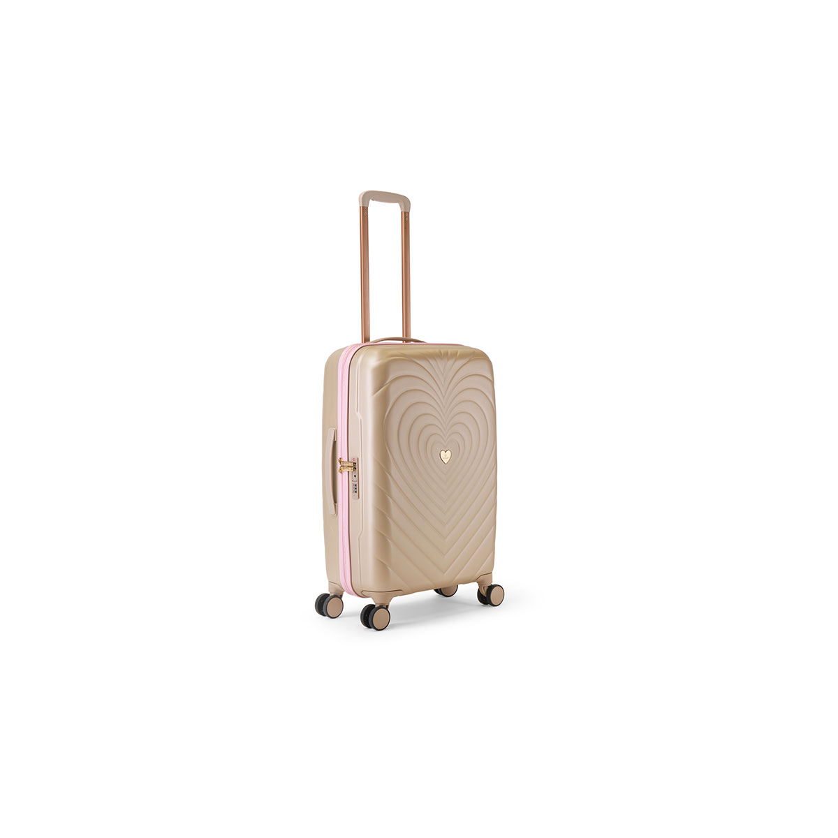 Viaggia con stile con il trolley medio rigido Braccialini, un accessorio raffinato e pratico per chi ama distinguersi. Il design oro sofisticato è impreziosito da una lavorazione a rilievo con motivo a cuore che dona volume, carattere e un tocco romantico all’intera silhouette. La chiusura piatta a combinazione con TSA e la zip espandibile assicurano praticità e sicurezza. Il manico telescopico regolabile con dettagli rosa aggiunge femminilità, così come le quattro ruote multidirezionali con rotazione a 360° che garantiscono un trasporto fluido. Gli interni, funzionali e ben organizzati, includono doppio divisorio ed elastici ferma abiti per ridurre pieghe e mantenere tutto in ordine. Completa il look il luggage tag a cuore in gomma rosa e la sacca riponi valigia coordinata.