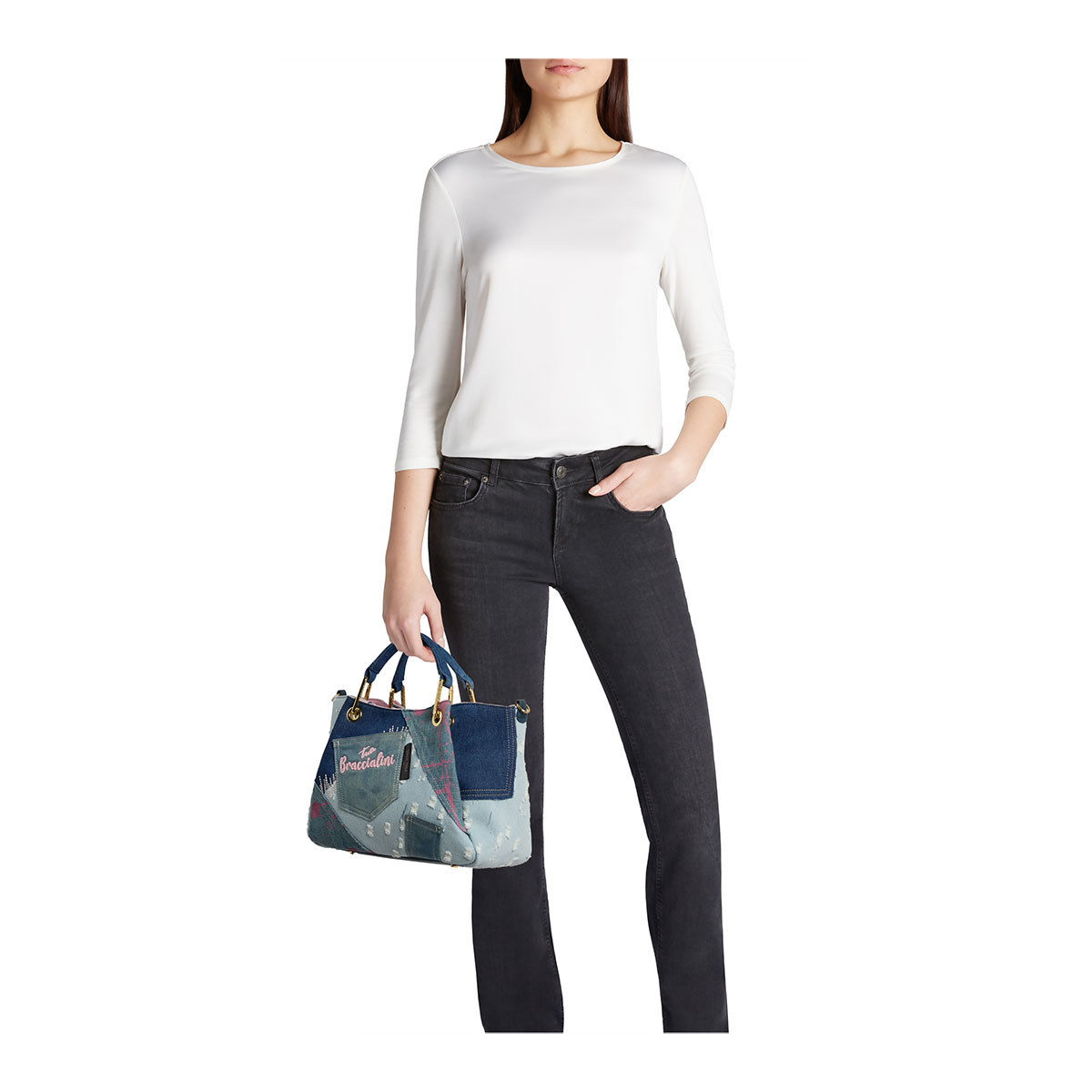 Borsa a mano di medie dimensioni con doppi manici, dal design versatile e capiente grazie ai pannelli laterali ampliabili nascosti nelle cuciture. Realizzata in denim con patchwork di lavaggi, spruzzi di colore, ricami e borchie, offre un look grintoso e creativo. L’interno a contrasto rosa e i dettagli in metallo dorato aggiungono un tocco femminile. Dotata di pochette interna estraibile e tracolla in jeans logata, removibile e regolabile, per una doppia portabilità.