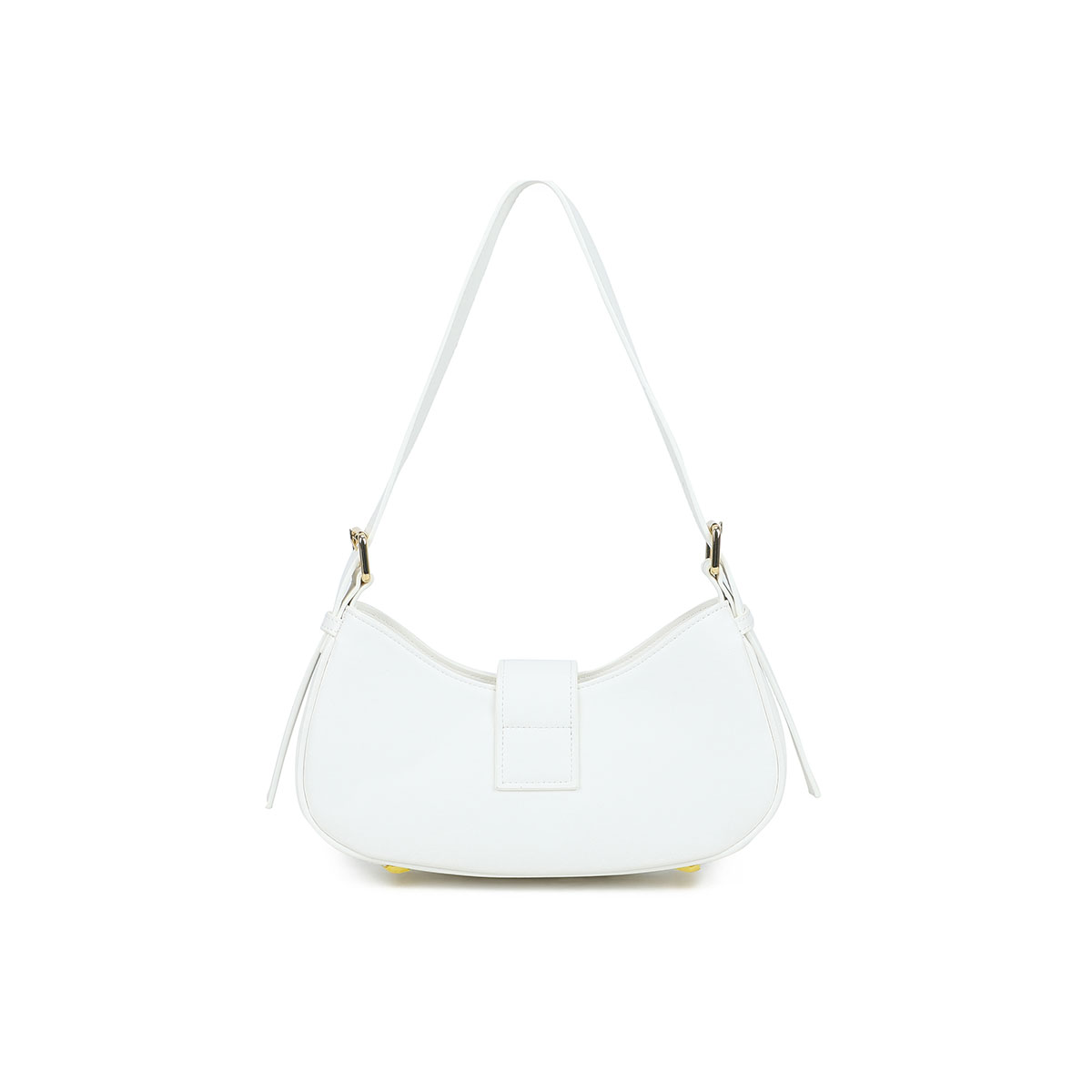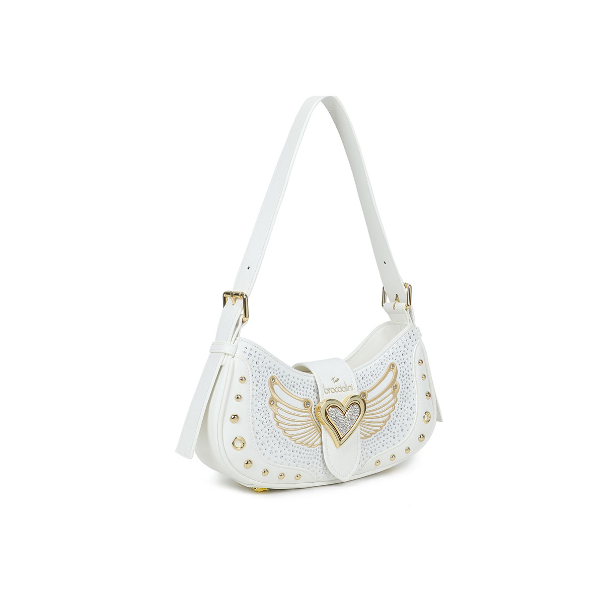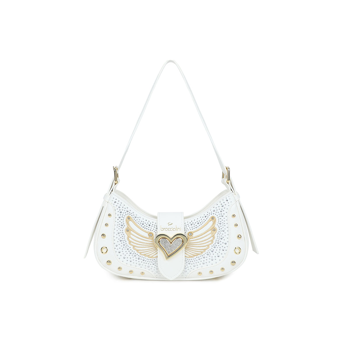 Вневременная белая сумка на плечо превращается в смелое заявление о стиле. Эту модель отличает эффектный «дождь» из заклёпок и сияющих элементов, мерцающих на белой основе и напоминающих энергию огней мегаполиса. В центре образ завершает металлический аксессуар в форме сердца, придавая сумке рок-гламурный характер — для тех, кто не хочет оставаться незамеченным даже после наступления темноты.