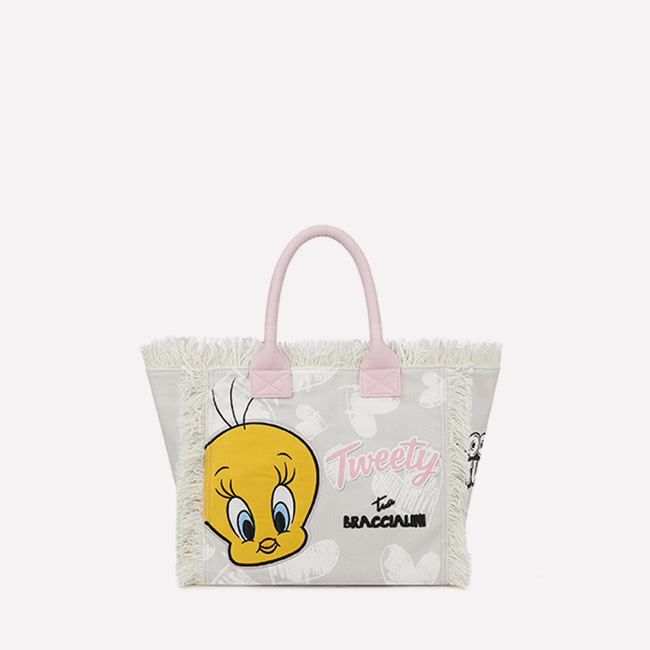 Большая, но компактная сумка-тоут с двойными ручками из ткани. Главным акцентом дизайна является вышивка: полёт бабочек в нежных пастельных оттенках на светлом фоне, среди стилизованных цветов с лёгкими очертаниями. Логотип Braccialini органично вписан в композицию и обрамлён вышитыми полосами, которые проходят по сумке, создавая ощущение гармонии и движения. В комплект входит удобная внутренняя косметичка и съёмный регулируемый ремень для двух вариантов ношения.