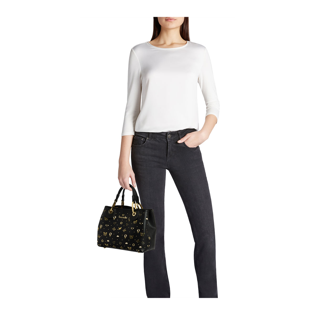 Сумка среднего размера чёрного цвета с двумя ручками и съёмным регулируемым плечевым ремнём с логотипом, позволяющим носить её разными способами. Внутри находится съёмный клатч, который можно использовать как вторую сумку. Дизайн украшен множеством золотых заклёпок в форме сердец, бабочек, воздушных шаров и облаков, покрывающих всю поверхность и создающих сияющий, выразительный образ.