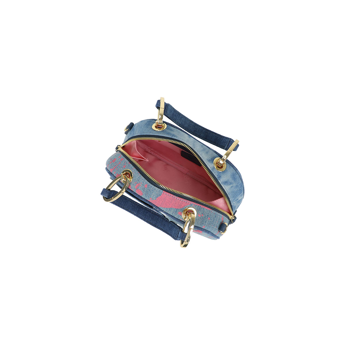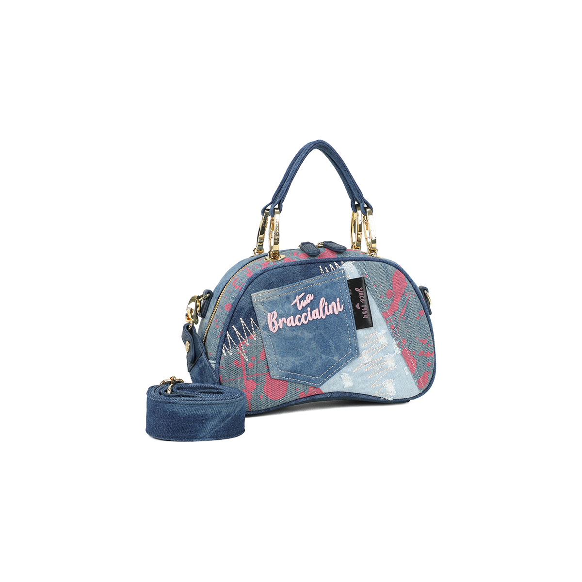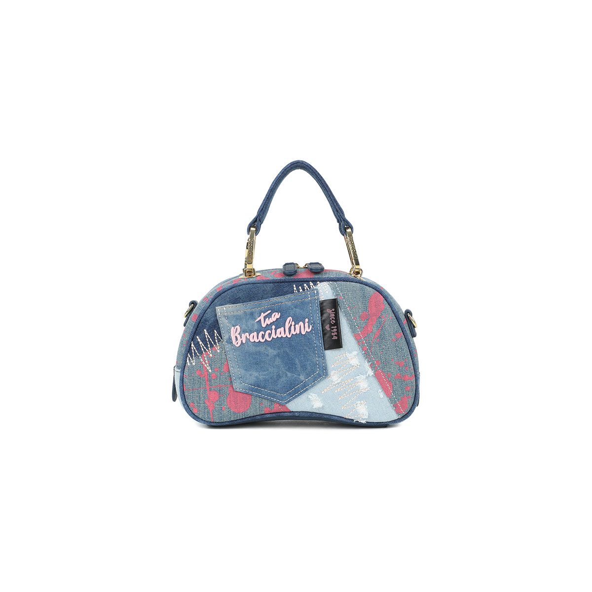 Небольшая сумка-боулинг из джинсовой ткани с ярким и оригинальным характером, украшенная креативным патчем с эффектом выцветания, декоративной вышивкой и принтом в виде цветных брызг. Модель дополнена накладным карманом в стиле классических «пяти карманов» с контрастным розовым вышитым логотипом Braccialini. Оснащена двойными ручками и съёмным регулируемым плечевым ремнём из ткани для двух вариантов ношения. Динамичный и дерзкий аксессуар, идеально подходящий для тех, кто любит выделяться стилем.