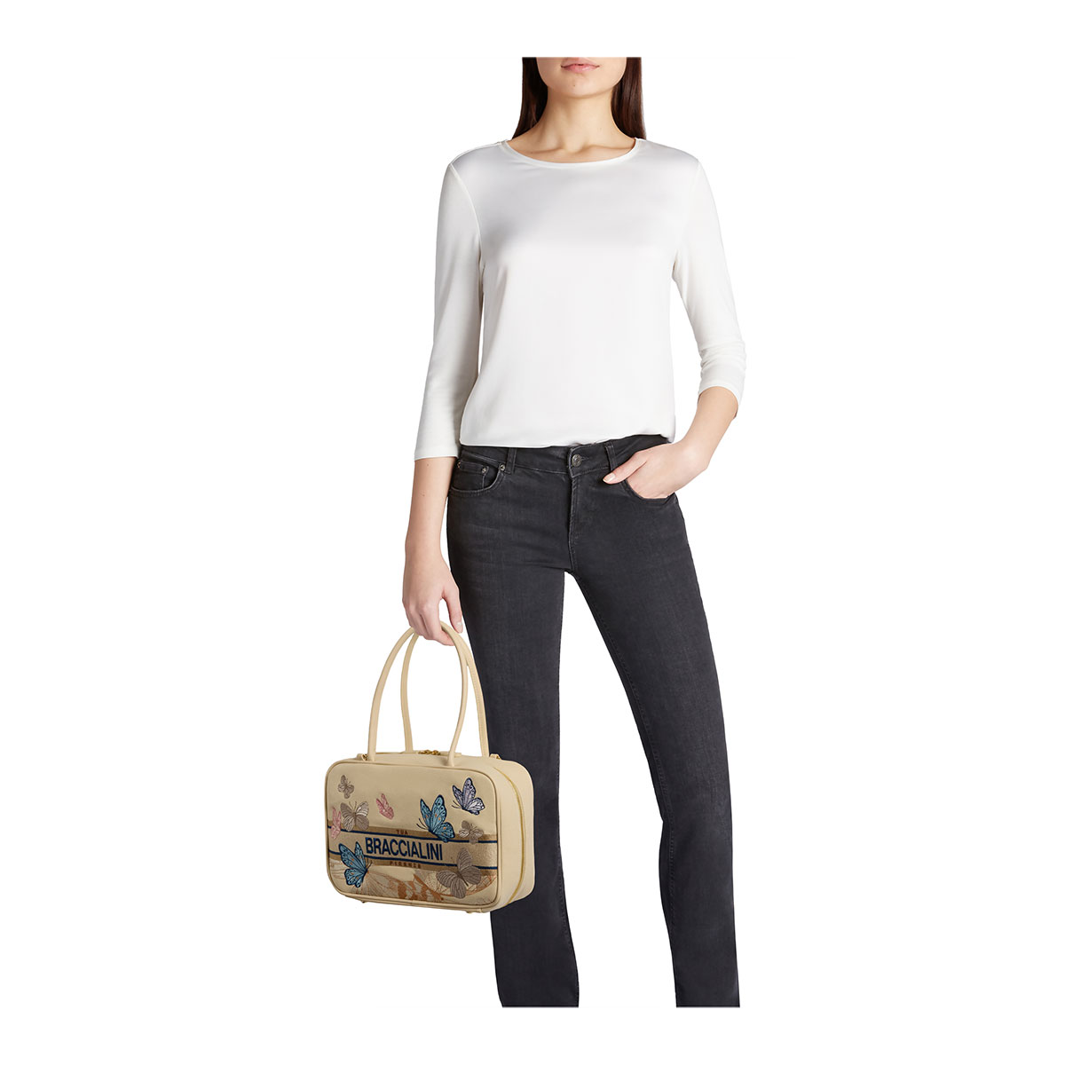 Компактная и изысканная сумка-боулинг, идеально подходящая для стильного повседневного образа. Главным мотивом сезона становятся бабочки, изящно вышитые на светлом и натуральном фоне. Логотип Braccialini гармонично интегрирован в дизайн, а однотонная отделка придаёт модели баланс и утончённость. Оснащена жёсткими ручками и съёмным регулируемым плечевым ремнём, сочетая элегантность и практичность в уникальном аксессуаре с неподвластным времени очарованием.