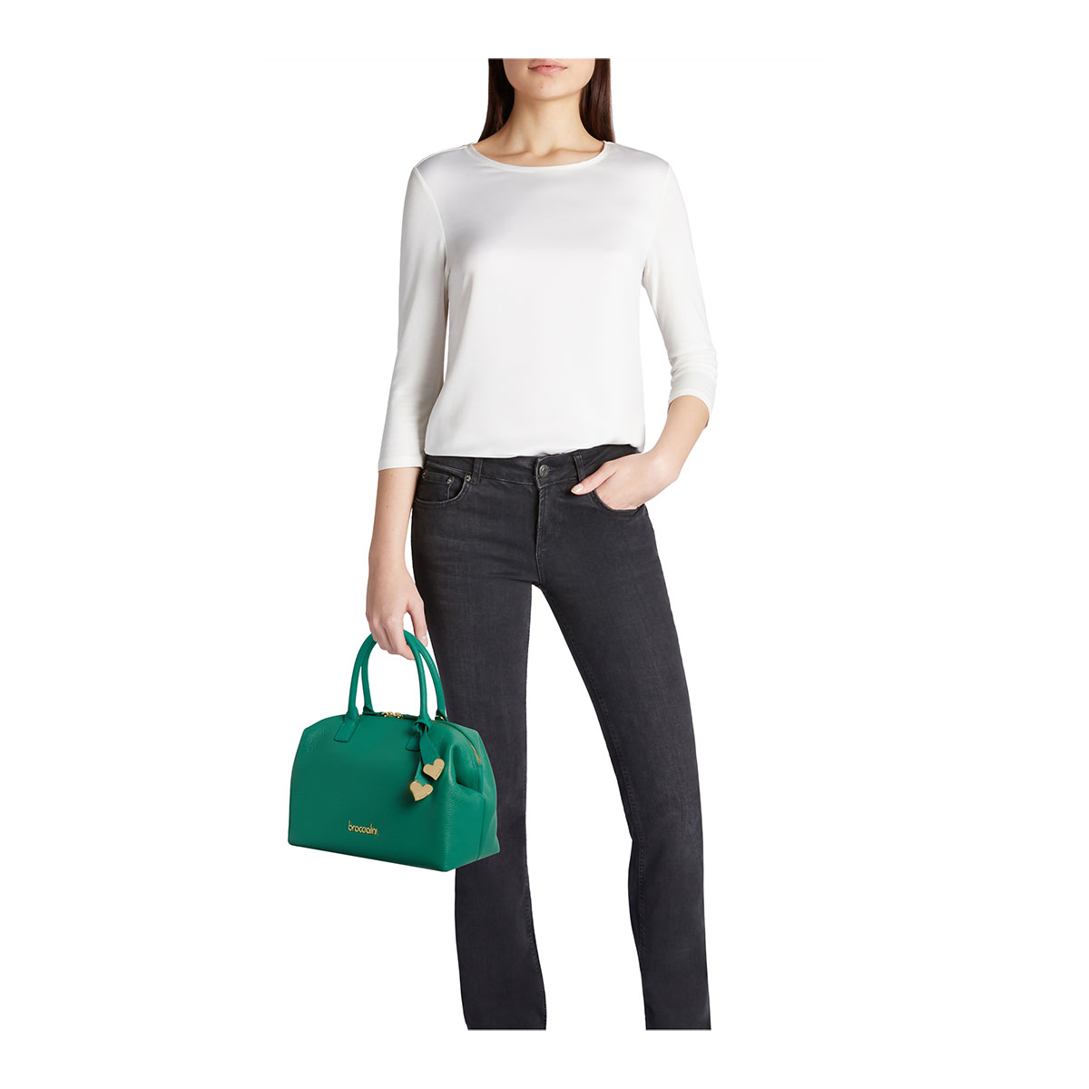Сумка-боулинг из кожи изумрудного цвета с двойными ручками и съёмным регулируемым плечевым ремнём, обеспечивающим два варианта ношения. Оснащена двойной застёжкой-молнией из металла золотого цвета и отличается чистым, структурированным дизайном, идеально подходящим для повседневного использования. Лаконичная и изысканная модель для тех, кто ценит практичность, не отказываясь от элегантности. Образ дополняет кожаный брелок с металлическими элементами золотого цвета в форме сердечка, придающий романтичный и выразительный акцент.