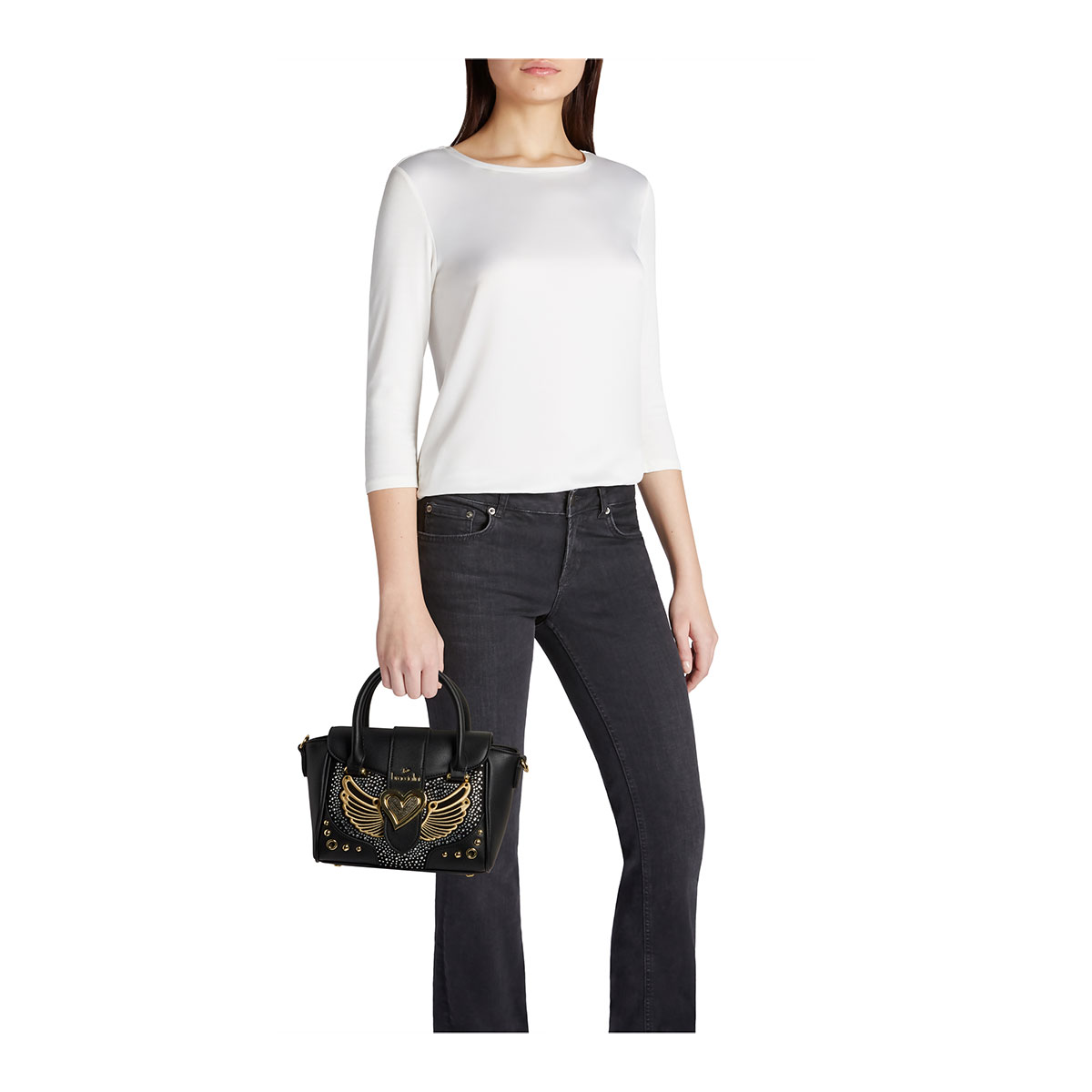 Вневременная белая сумка в руку превращается в смелое заявление о стиле. Эту модель отличает эффектный «дождь» из заклёпок и сияющих элементов, мерцающих на полностью белой основе и напоминающих энергию огней мегаполиса. В центре образ завершает металлический аксессуар в форме сердца, придавая сумке рок-гламурный характер — для тех, кто не хочет оставаться незамеченным даже после наступления темноты.